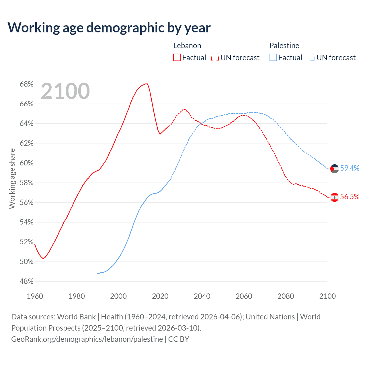 - Lebanon has 3.76M working age adults (aged 15-64) vs 3.2M in Palestine.