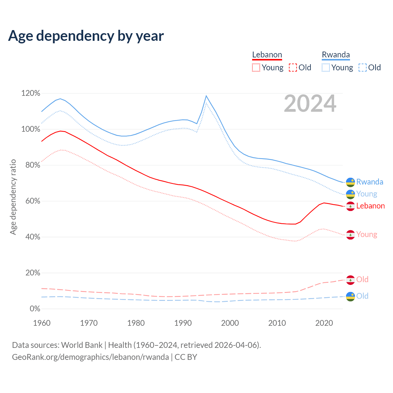 - The share of old-age demographic (65+) in Lebanon is 10.1% vs 3.93% in Rwanda.