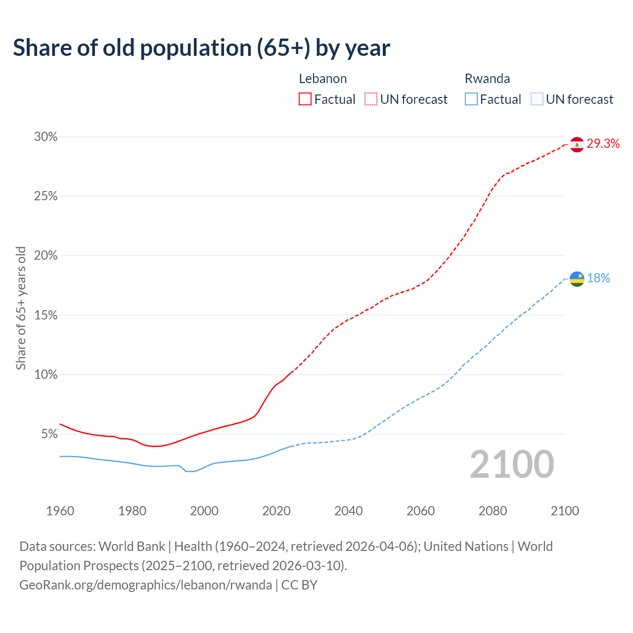 The share of older people aged 65 and over is 10.1% in Lebanon and 3.93% in Rwanda. Life expectancy in Lebanon compared to Rwanda .