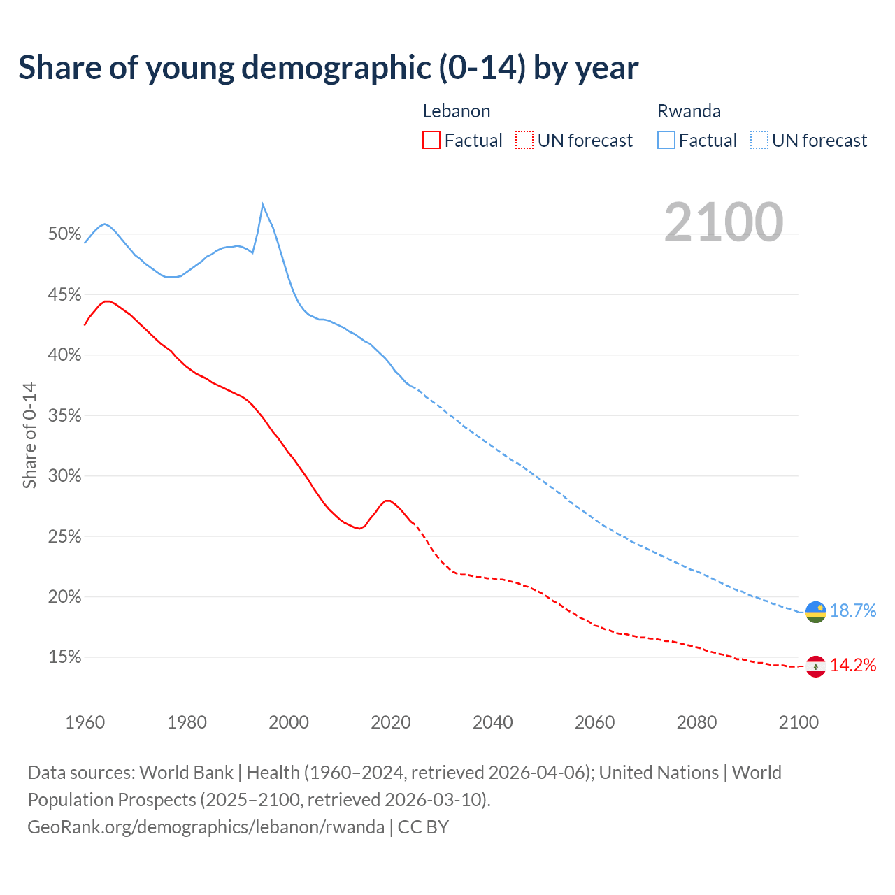 Median age Lebanon vs Rwanda, 1960-2100