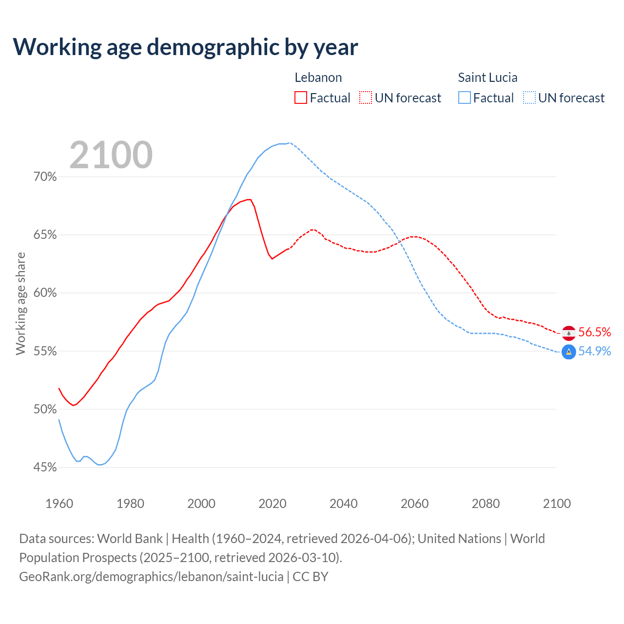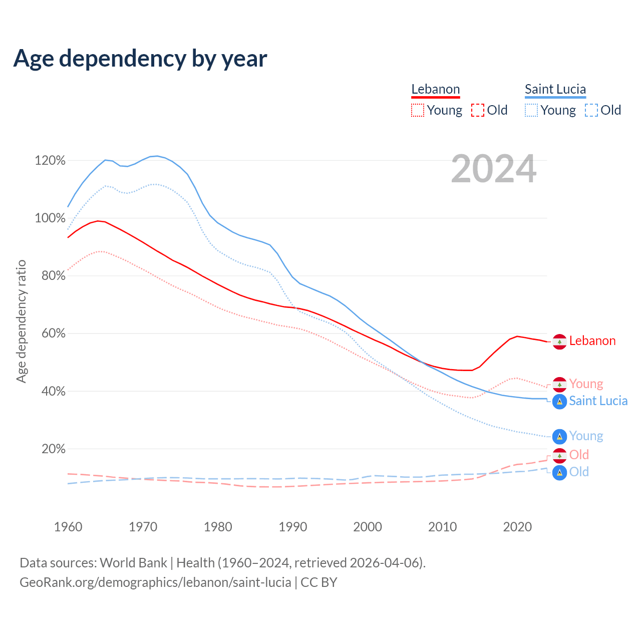 - The share of young demographic (0-15 years old) in Lebanon is 26.2% vs 17.5% in Saint Lucia.