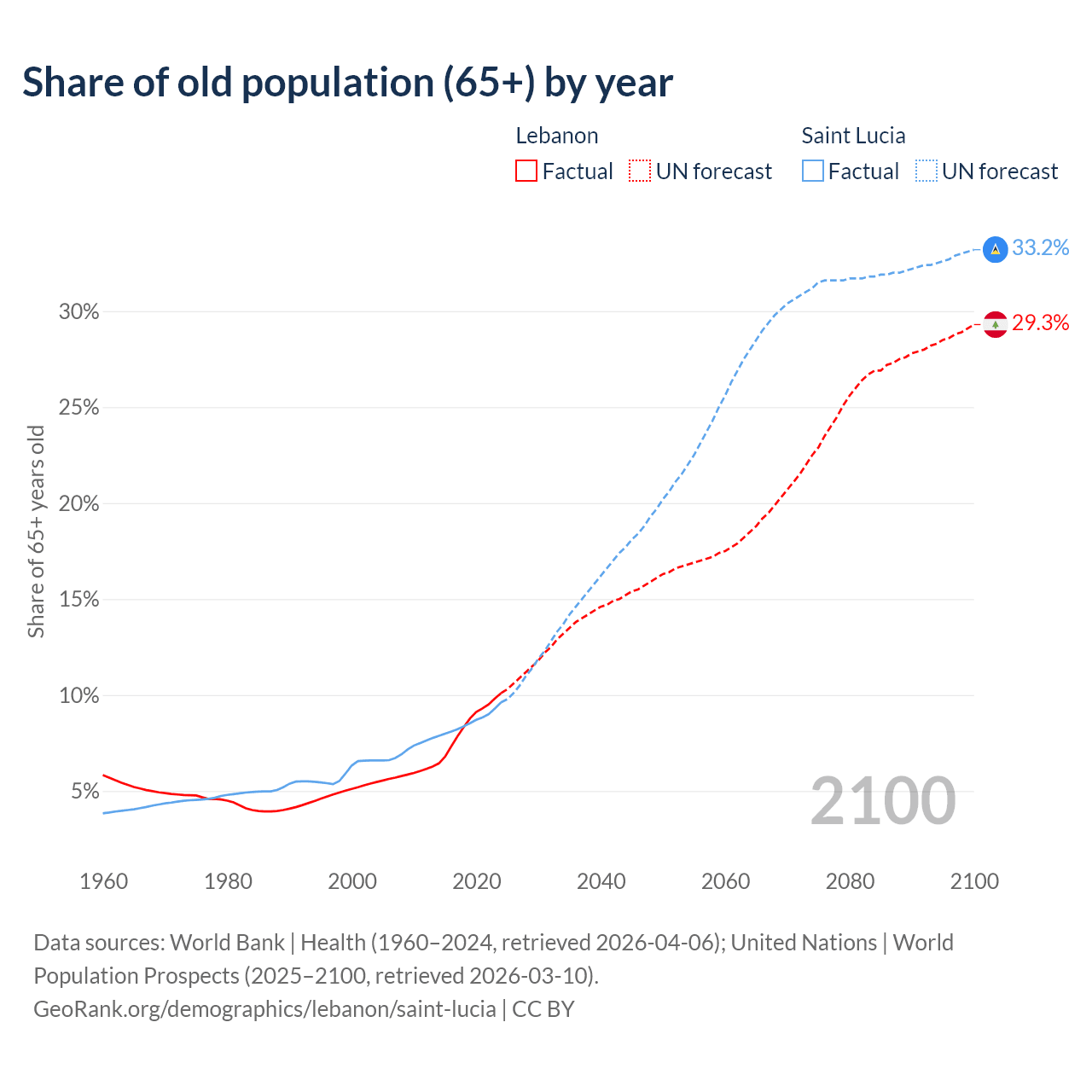 - The share of old-age demographic (65+) in Lebanon is 10.1% vs 9.62% in Saint Lucia.