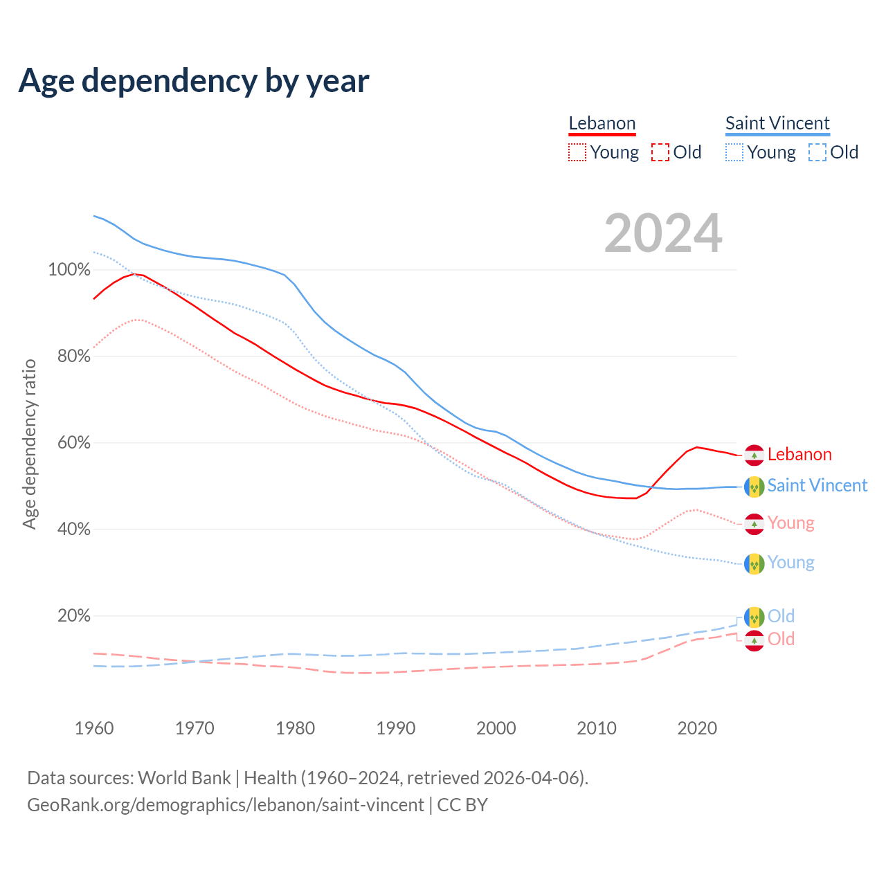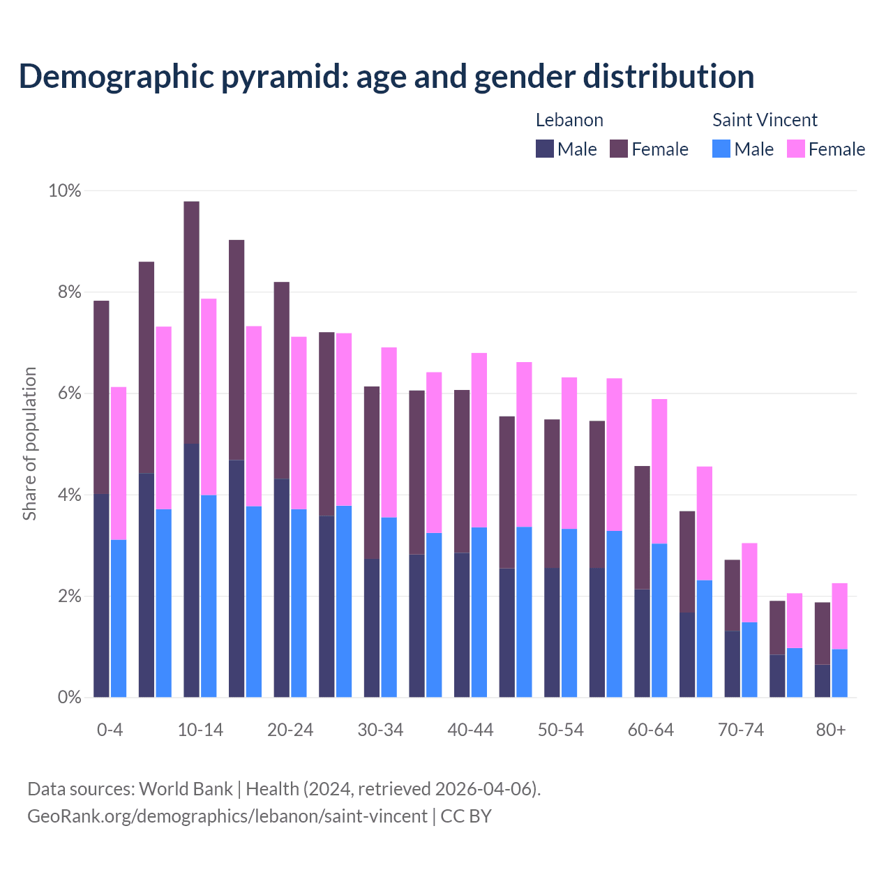 - The share of young demographic (0-15 years old) in Lebanon is 26.2% vs 21.3% in Saint Vincent.