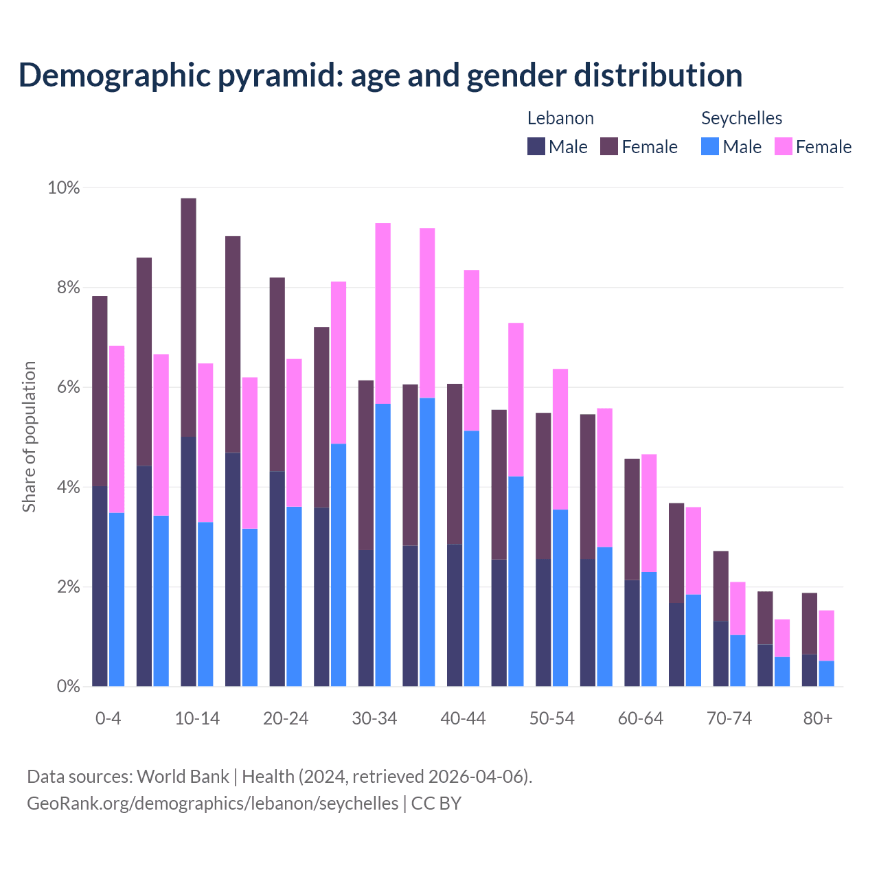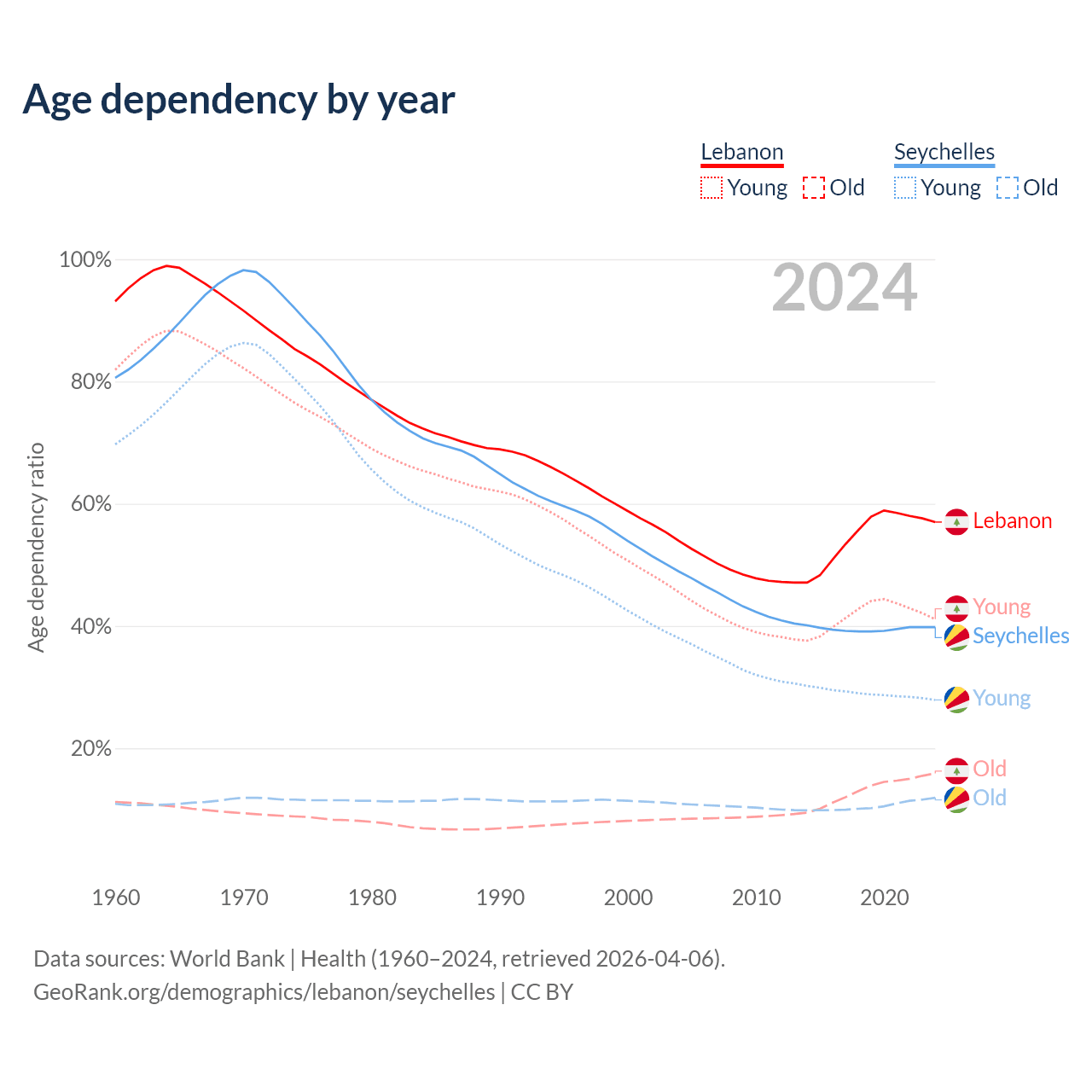 - Lebanon is ranked 106/196 by median age (oldest to youngest) vs 76/196 for the Seychelles.