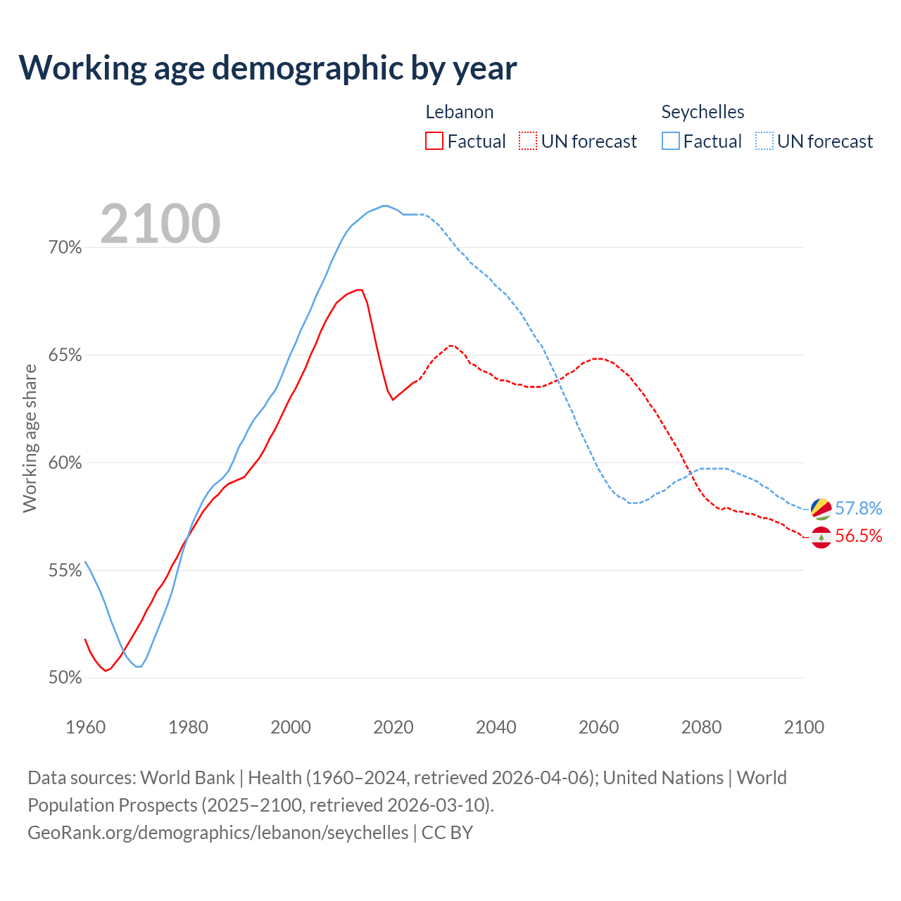 - Lebanon has 3.76M working age adults (aged 15-64) vs 90.3K in the Seychelles.