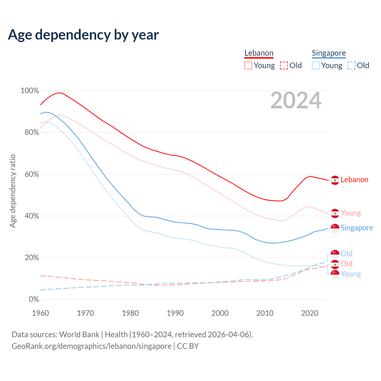 - Lebanon is ranked 106/196 by median age (oldest to youngest) vs 68/196 for Singapore.