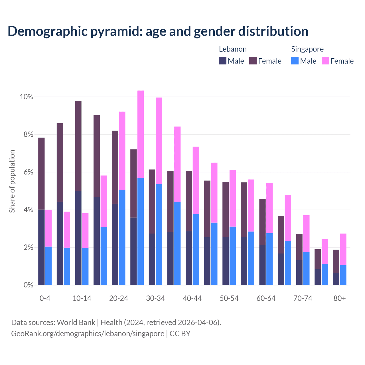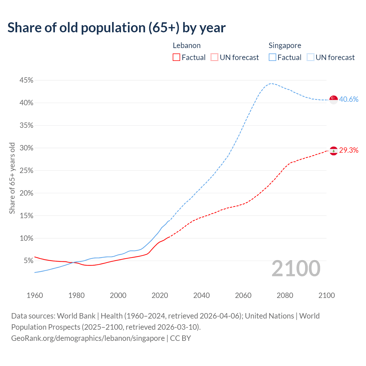 The share of older people aged 65 and over is 10.1% in Lebanon and 13.7% in Singapore. Life expectancy in Lebanon compared to Singapore .
