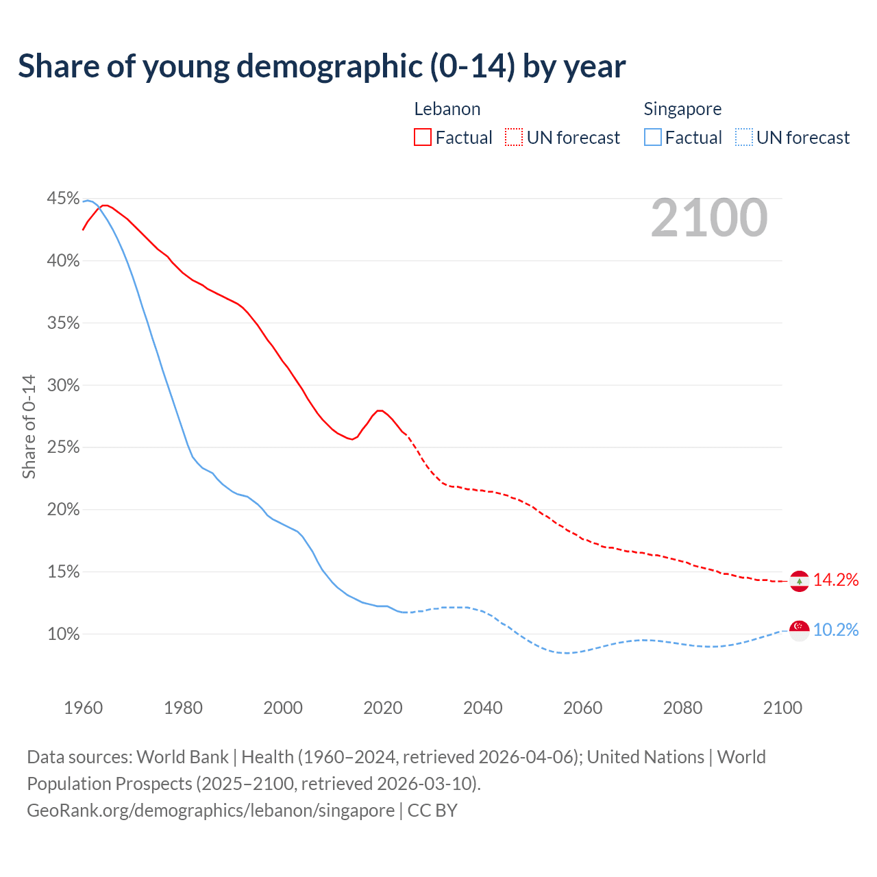 - The share of young demographic (0-15 years old) in Lebanon is 26.2% vs 11.7% in Singapore.