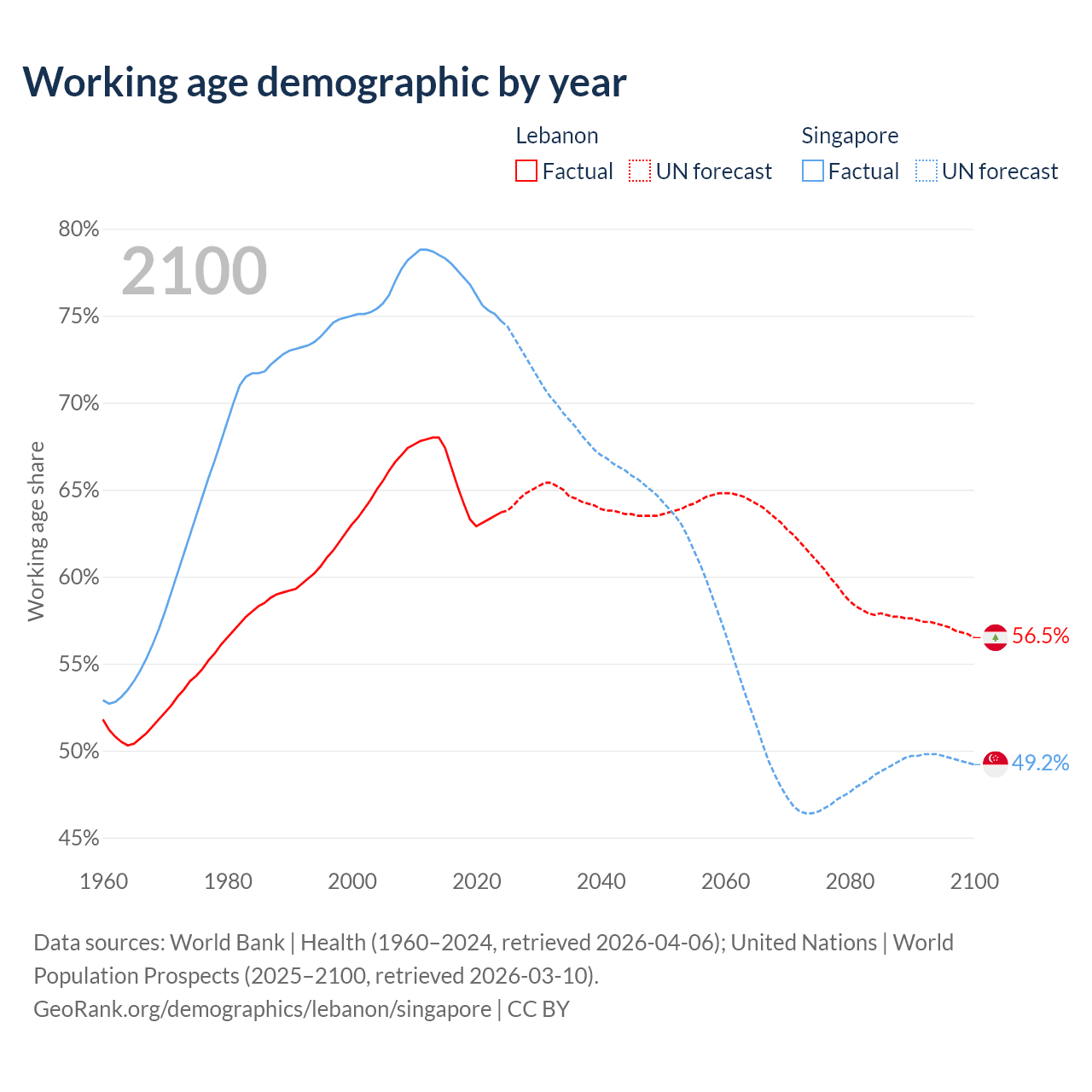 Median age Lebanon vs Singapore, 1960-2100