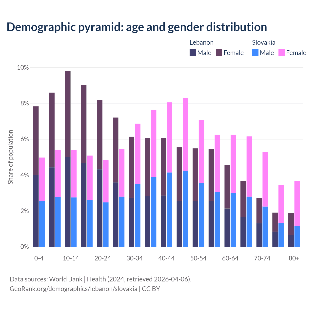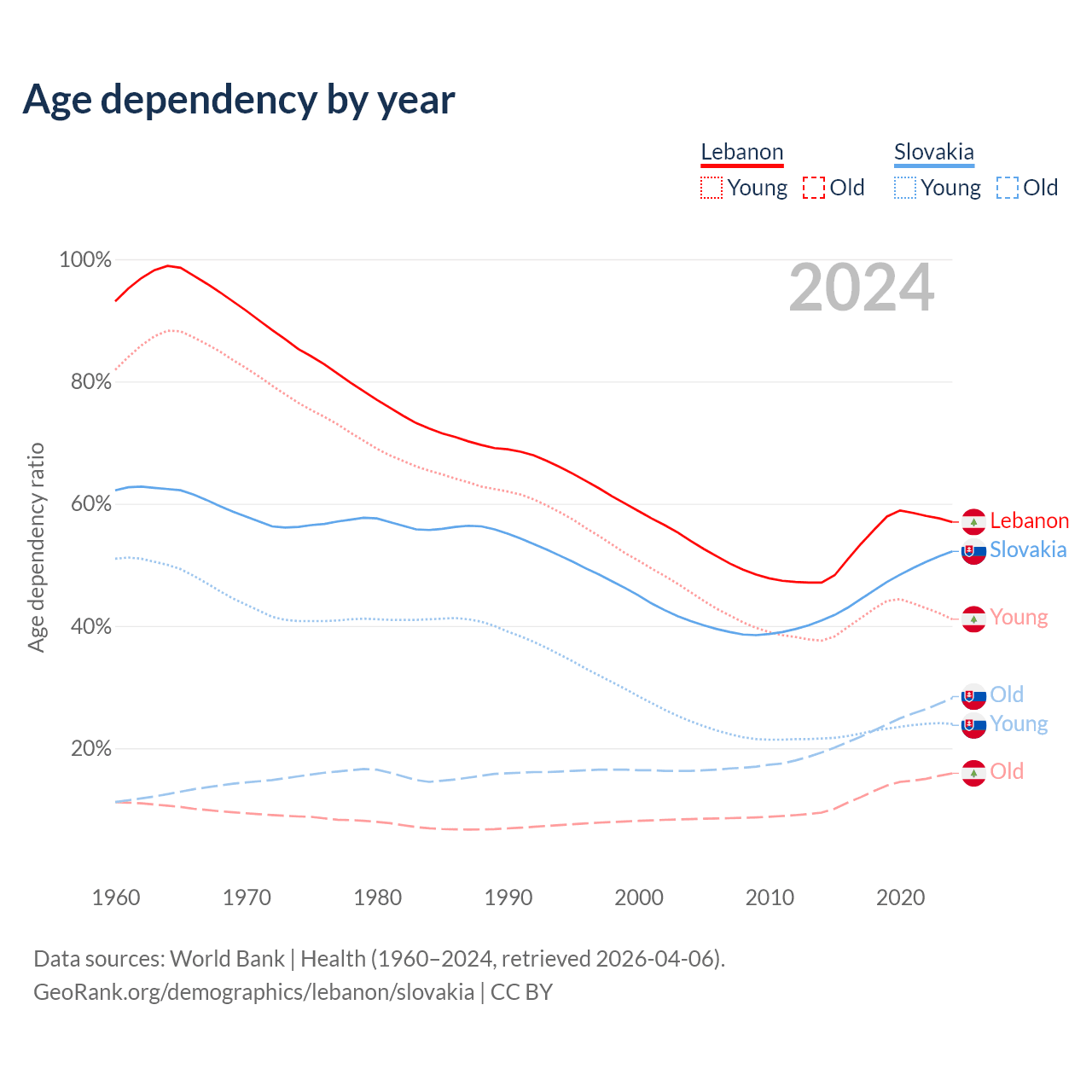 - Lebanon is ranked 106/196 by median age (oldest to youngest) vs 31/196 for Slovakia.