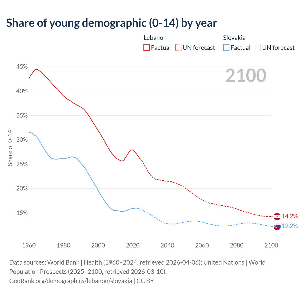 - The share of young demographic (0-15 years old) in Lebanon is 26.2% vs 15.8% in Slovakia.