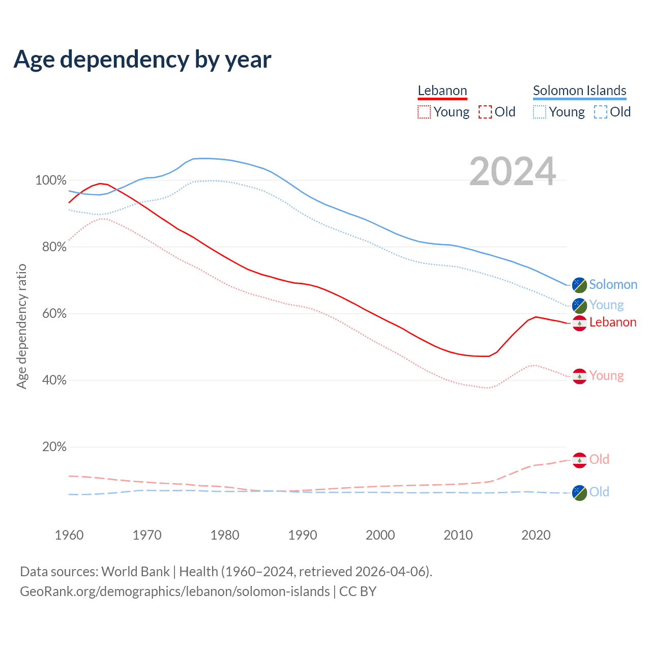 - Lebanon is ranked 106/196 by median age (oldest to youngest) vs 153/196 for the Solomon Islands.