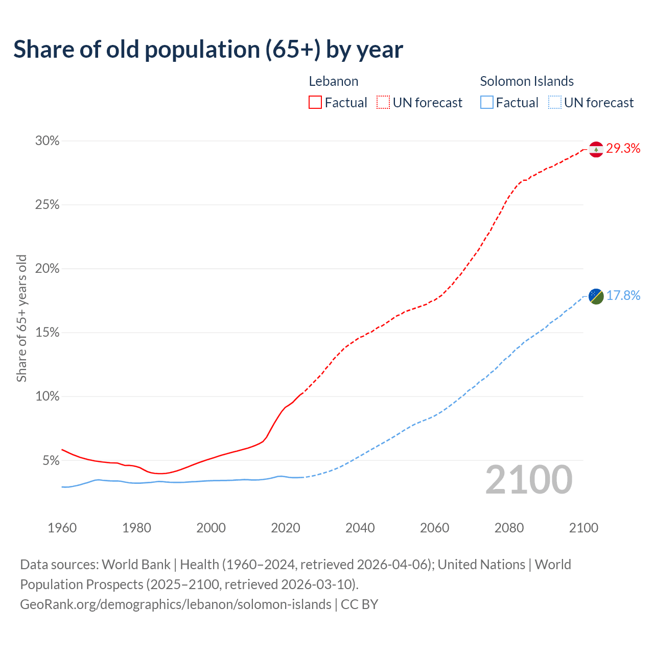 The share of older people aged 65 and over is 10.1% in Lebanon and 3.64% in the Solomon Islands. Life expectancy in Lebanon compared to the Solomon Islands .