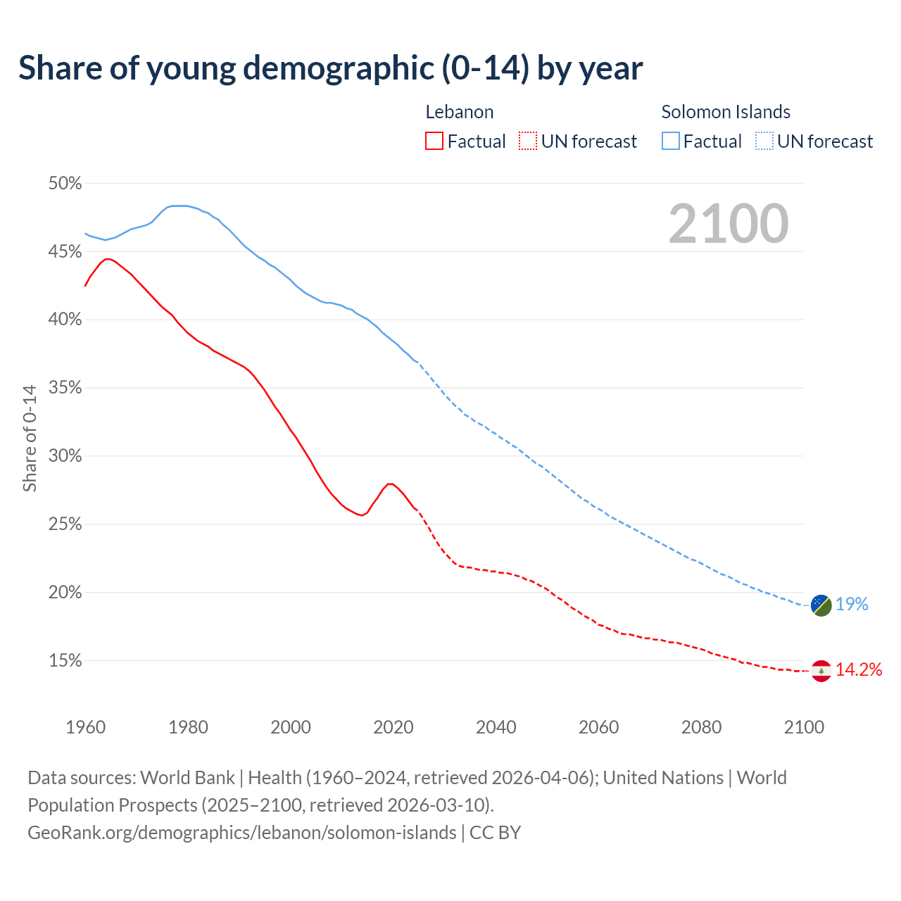 - The share of young demographic (0-15 years old) in Lebanon is 26.2% vs 37% in the Solomon Islands.