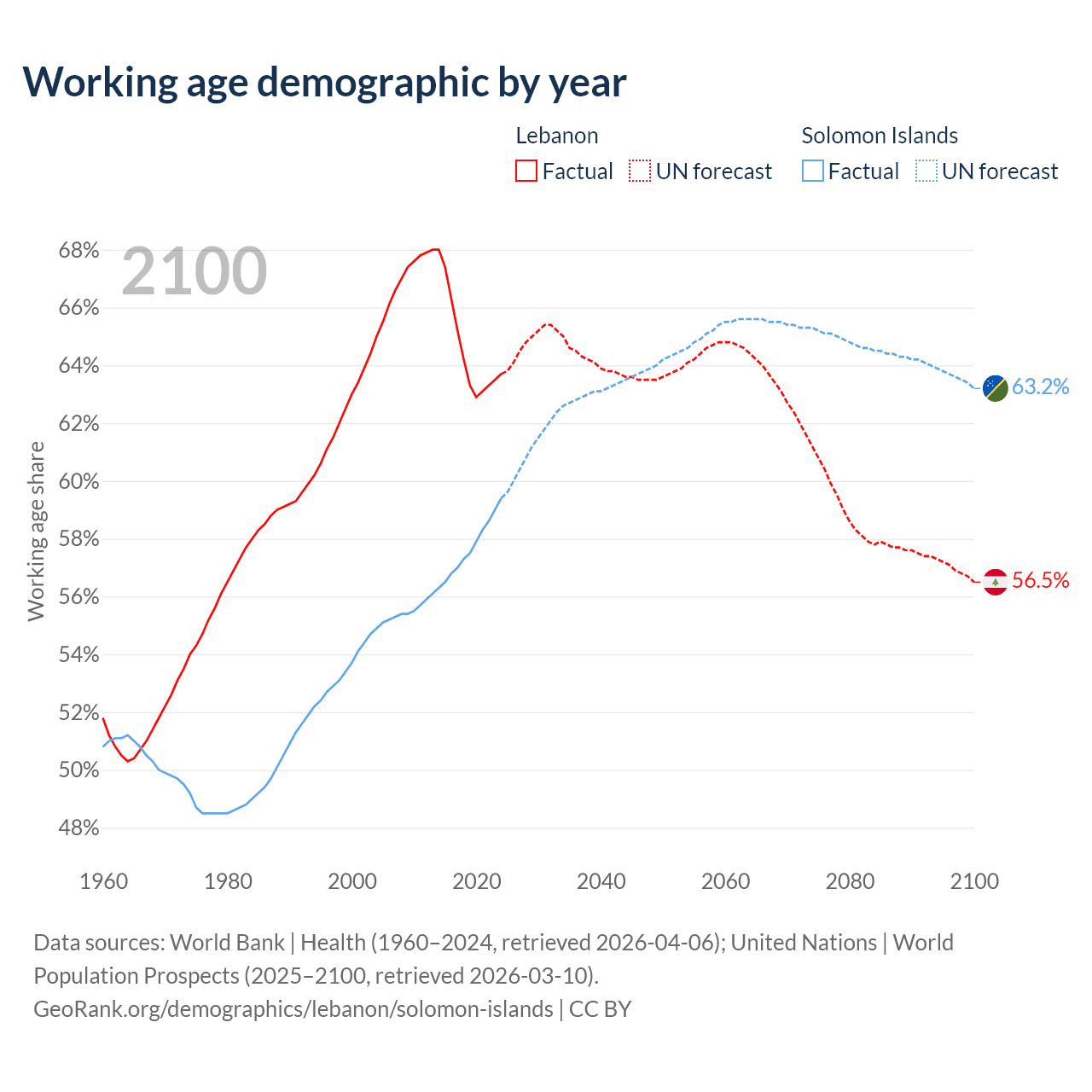 - Lebanon has 3.76M working age adults (aged 15-64) vs 513K in the Solomon Islands.