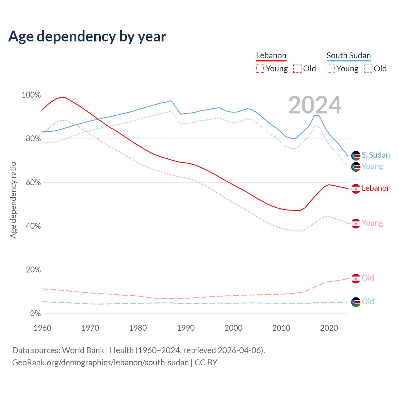 - Lebanon is ranked 106/196 by median age (oldest to youngest) vs 173/196 for South Sudan.