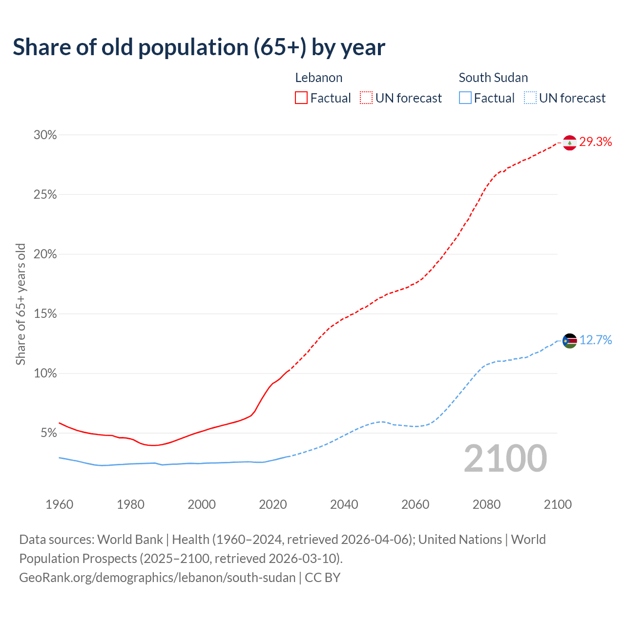 The share of older people aged 65 and over is 10.1% in Lebanon and 2.99% in South Sudan. Life expectancy in Lebanon compared to South Sudan .