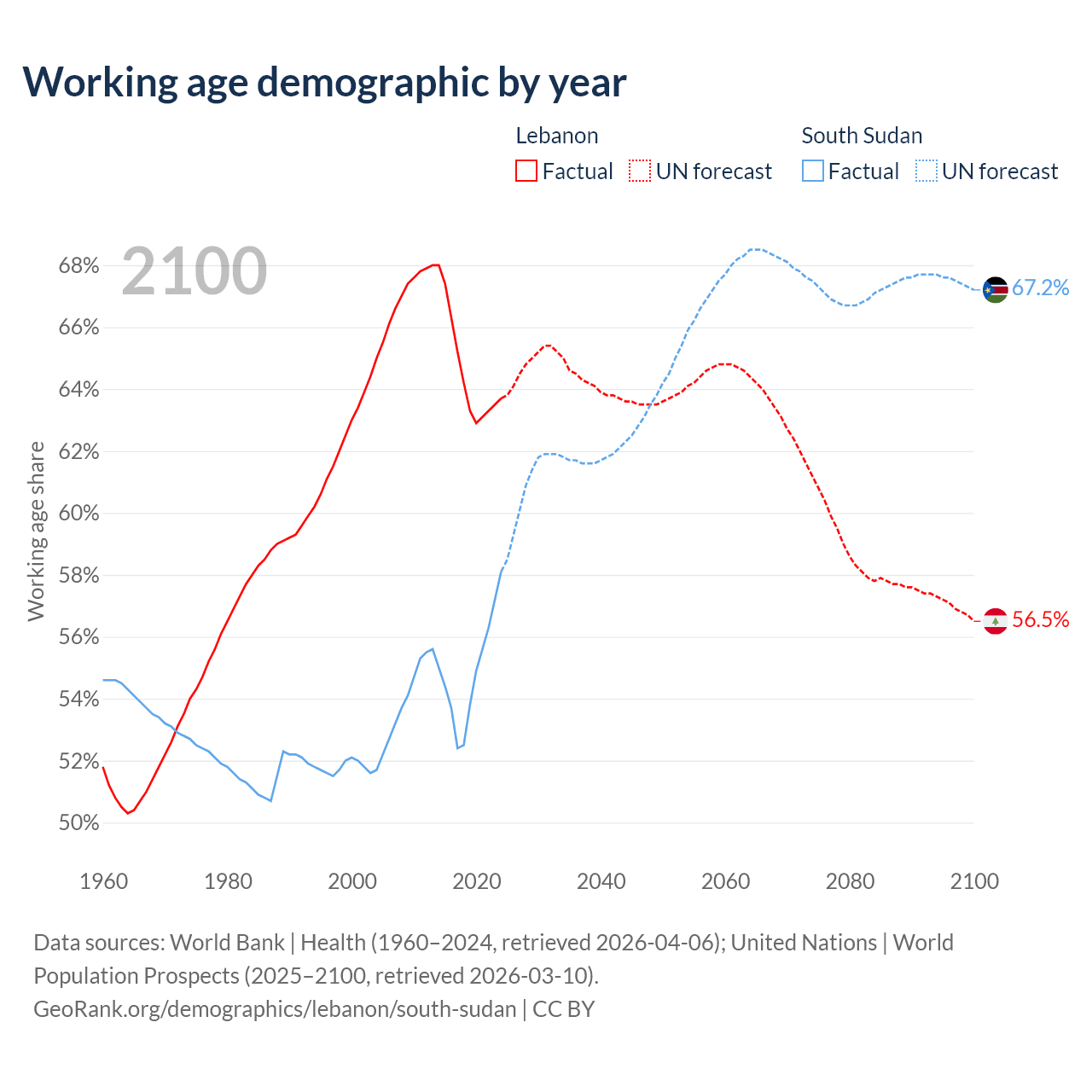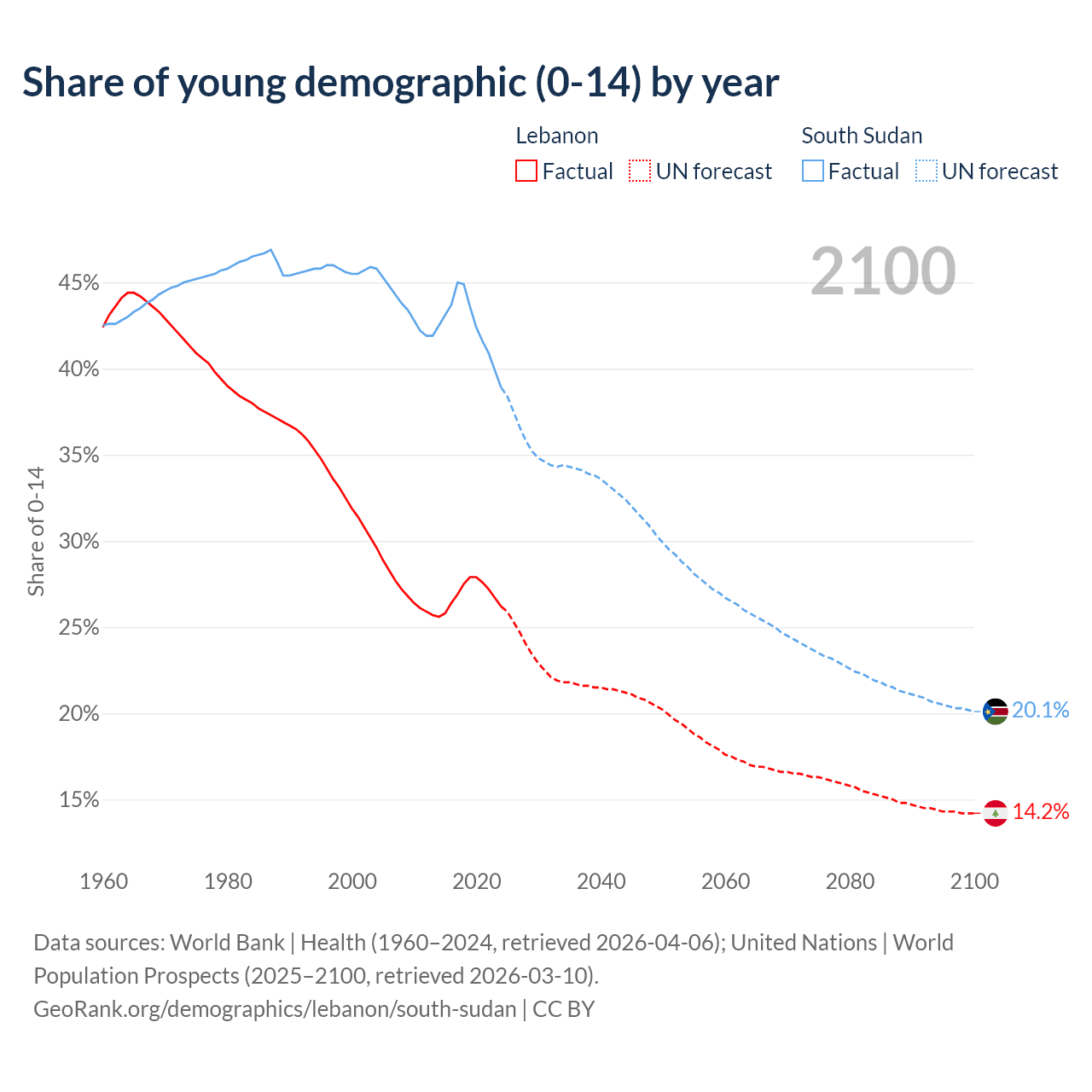 Median age Lebanon vs South Sudan, 1960-2100