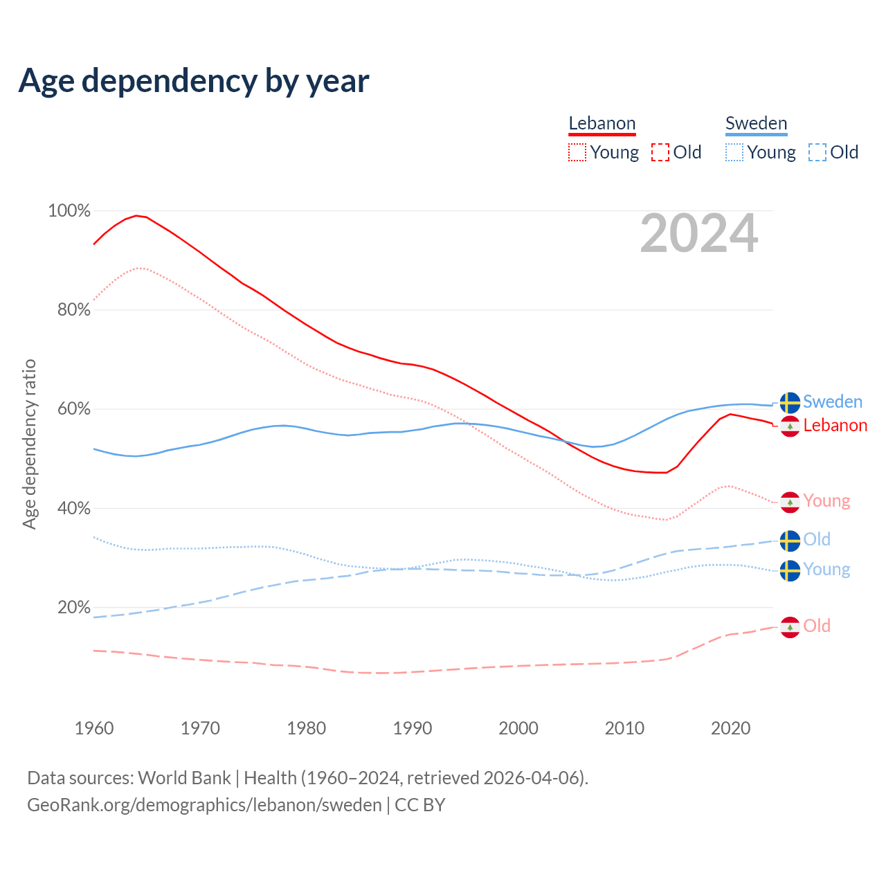 - Lebanon is ranked 106/196 by median age (oldest to youngest) vs 39/196 for Sweden.