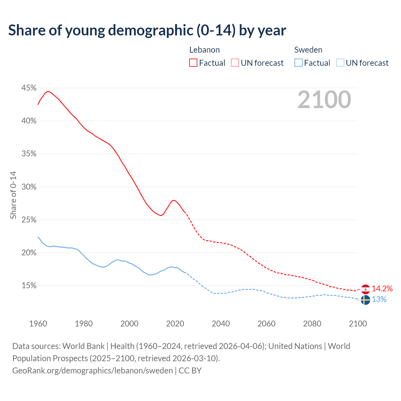 - The share of young demographic (0-15 years old) in Lebanon is 26.2% vs 17% in Sweden.