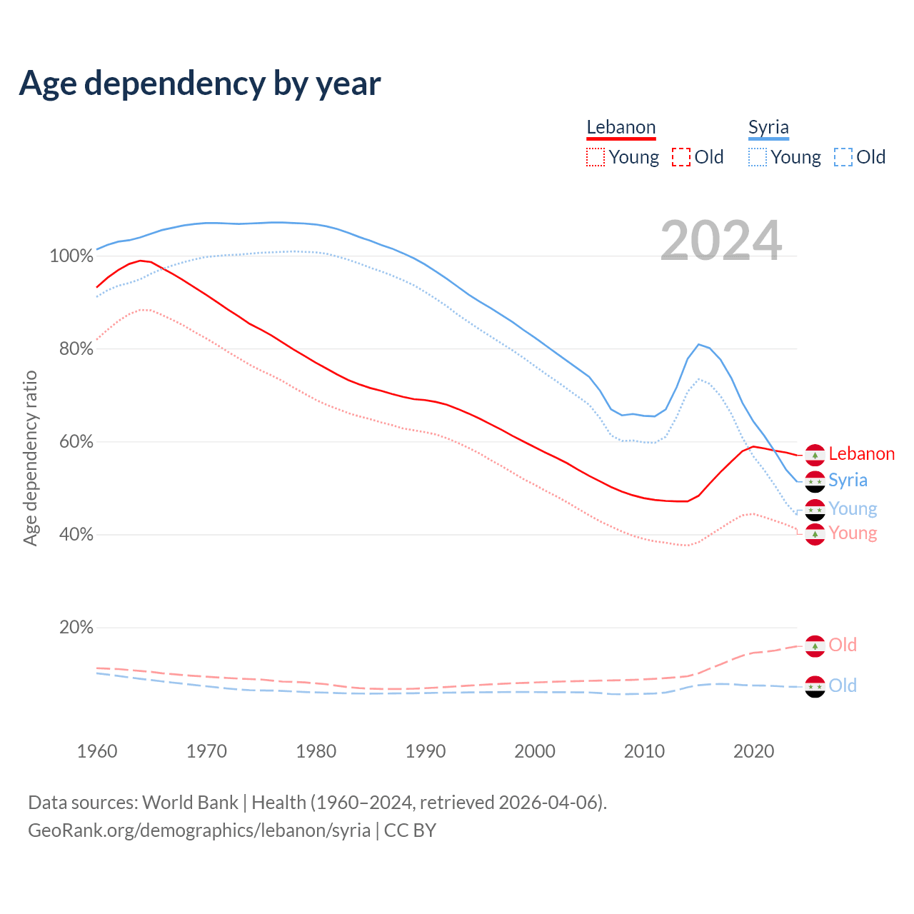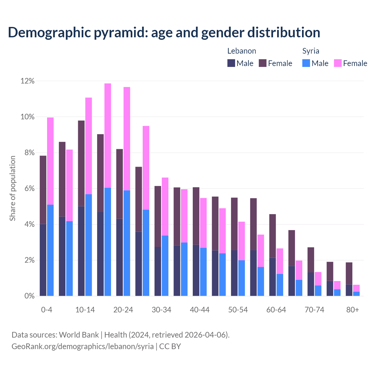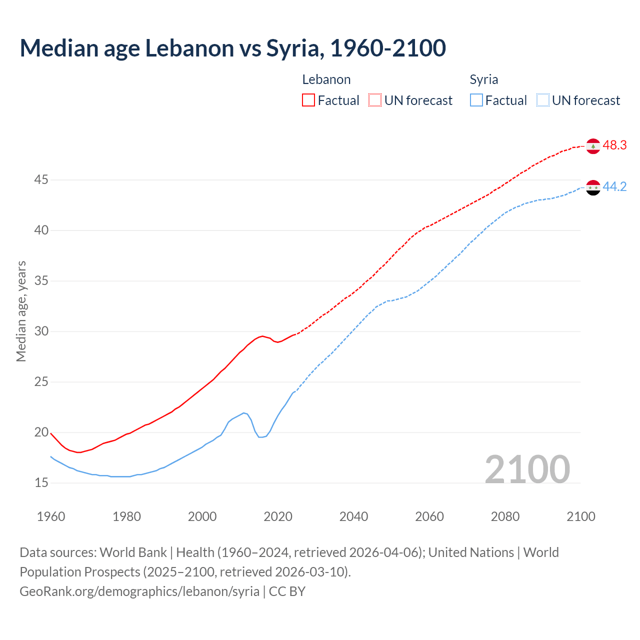 - Lebanon is ranked 106/196 by median age (oldest to youngest) vs 138/196 for Syria.