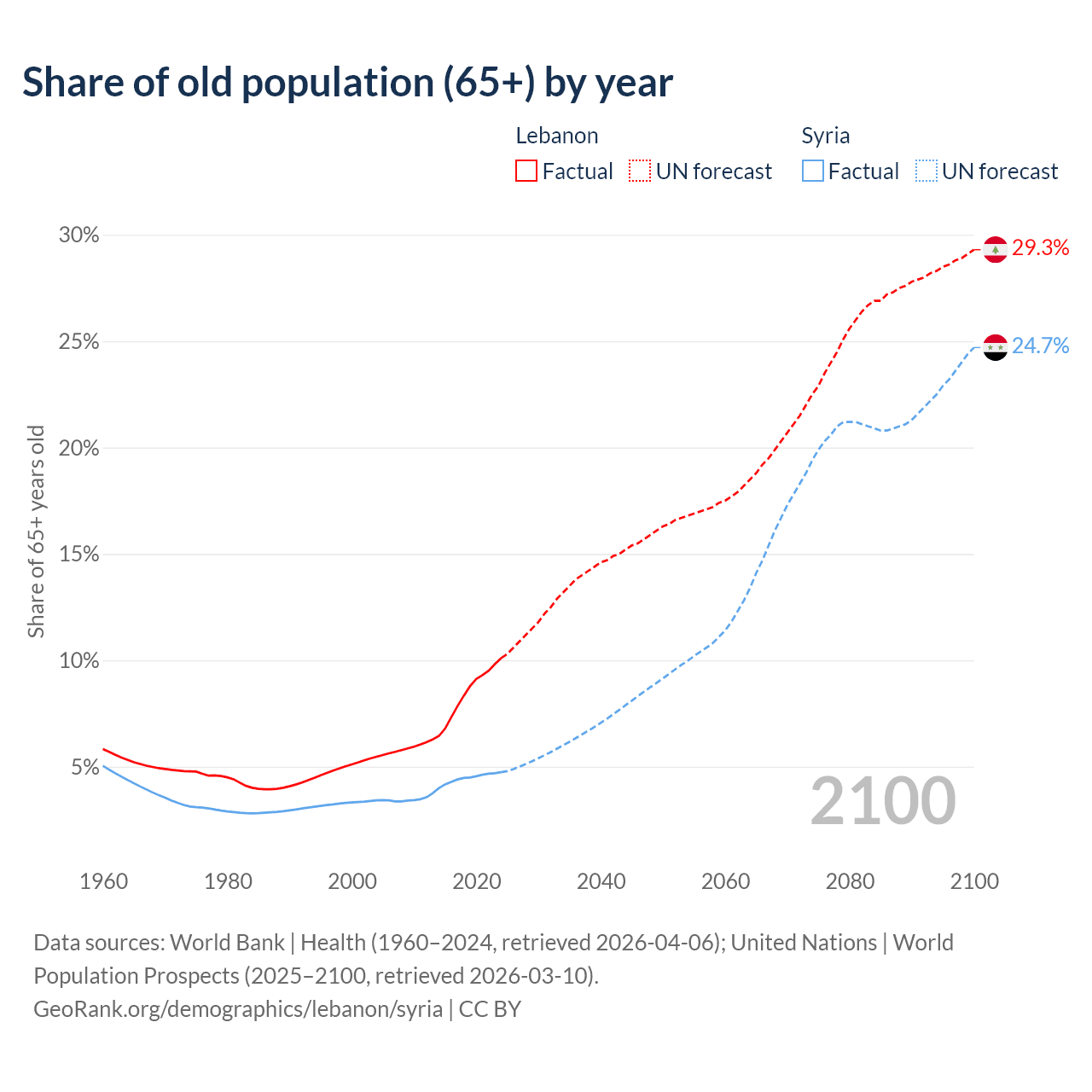 The share of older people aged 65 and over is 10.1% in Lebanon and 4.74% in Syria. Life expectancy in Lebanon compared to Syria .