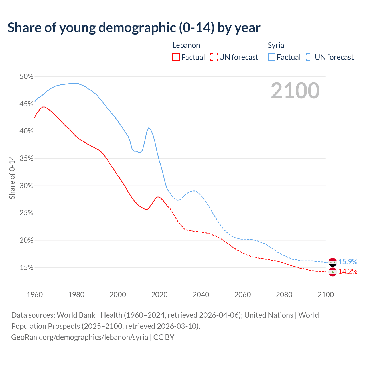 - The share of young demographic (0-15 years old) in Lebanon is 26.2% vs 29.2% in Syria.
