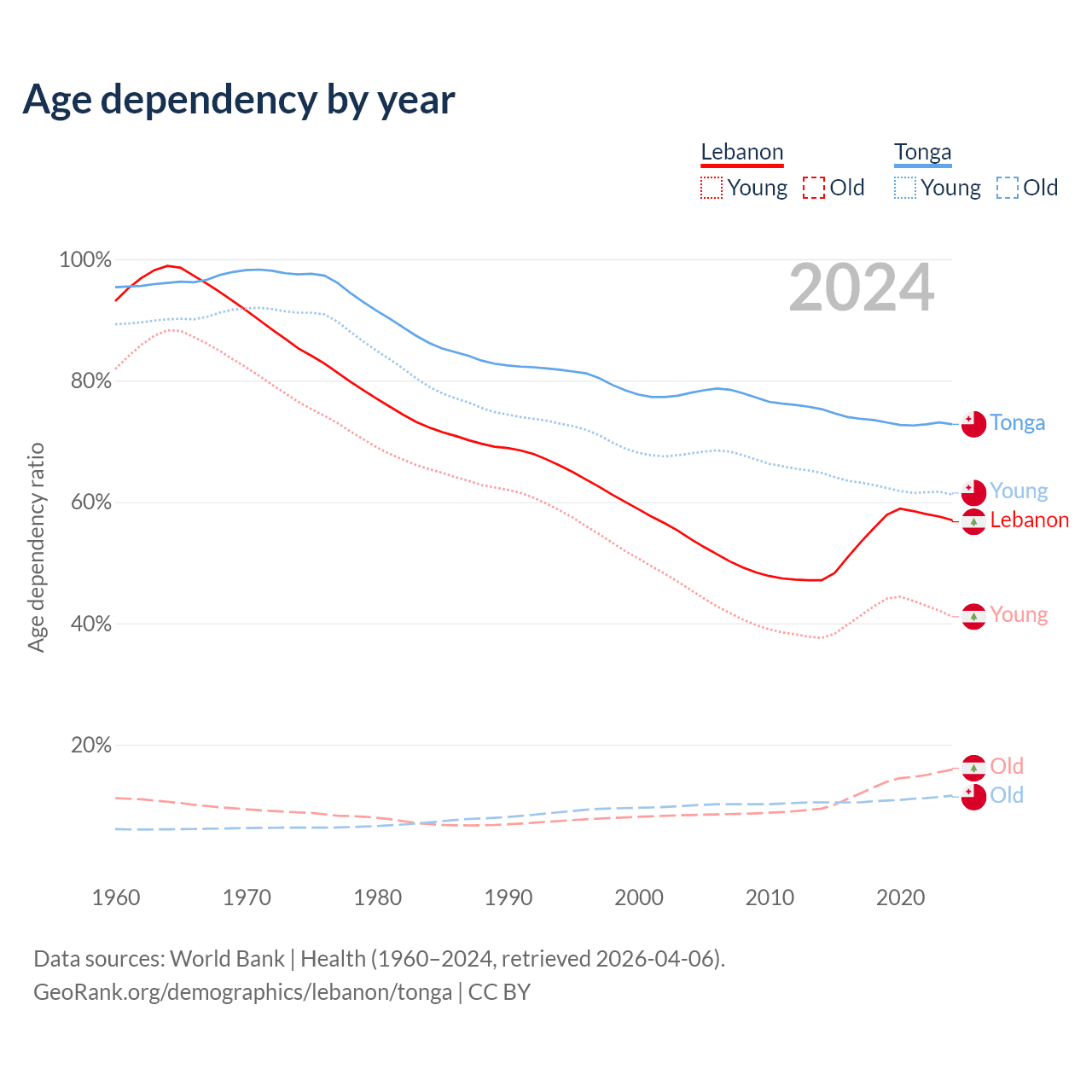 The share of older people aged 65 and over is 10.1% in Lebanon and 6.72% in Tonga. Life expectancy in Lebanon compared to Tonga .