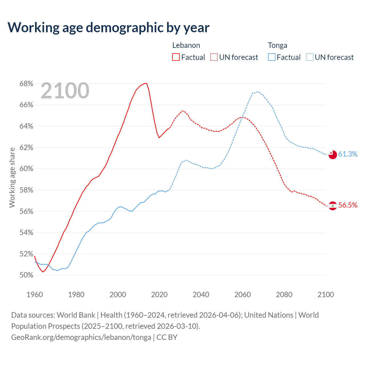 - Lebanon has 3.76M working age adults (aged 15-64) vs 59.8K in Tonga.