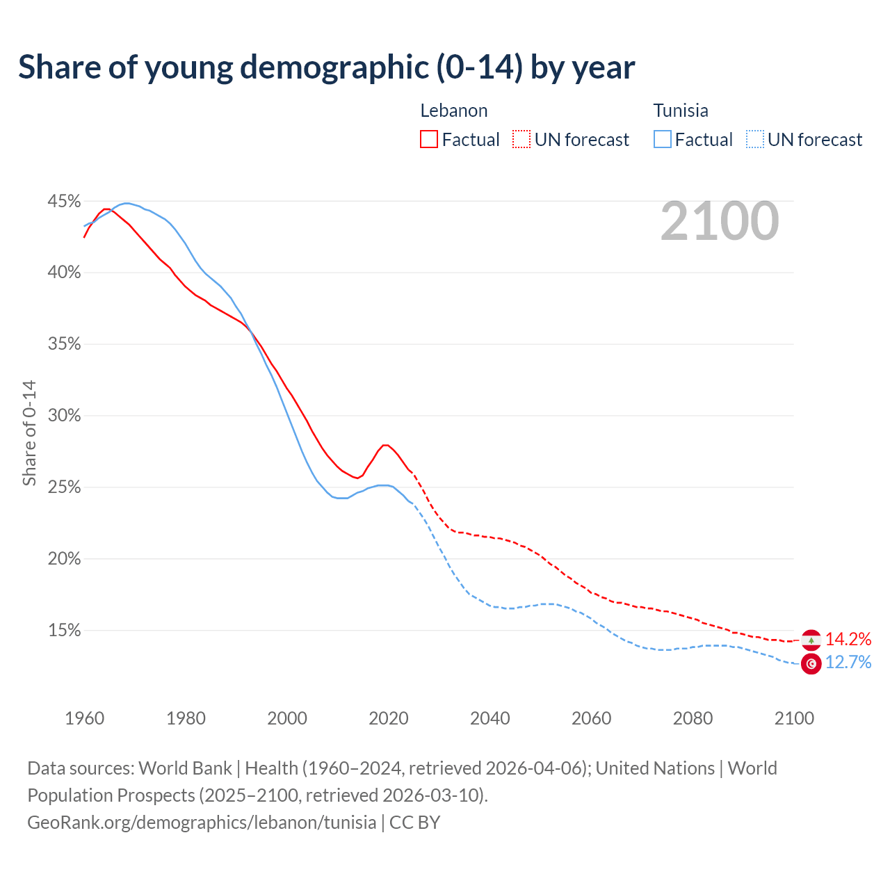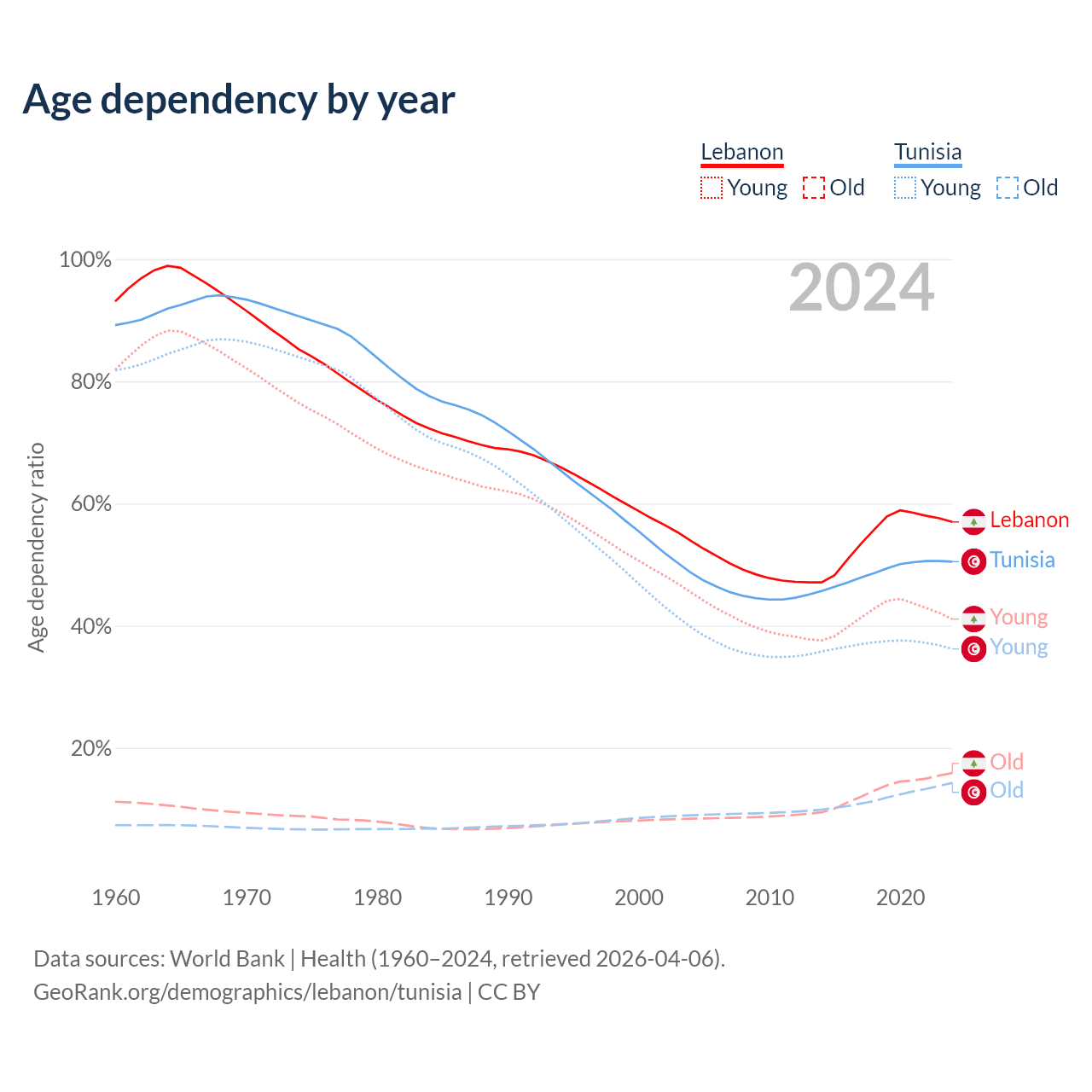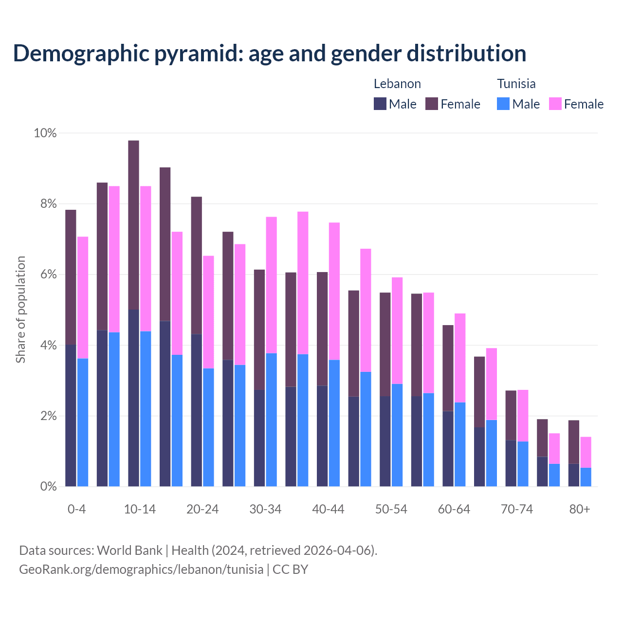 - Lebanon is ranked 106/196 by median age (oldest to youngest) vs 86/196 for Tunisia.