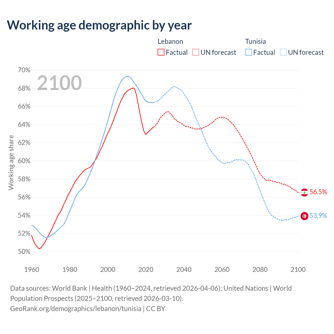 - Lebanon has 3.76M working age adults (aged 15-64) vs 8.26M in Tunisia.