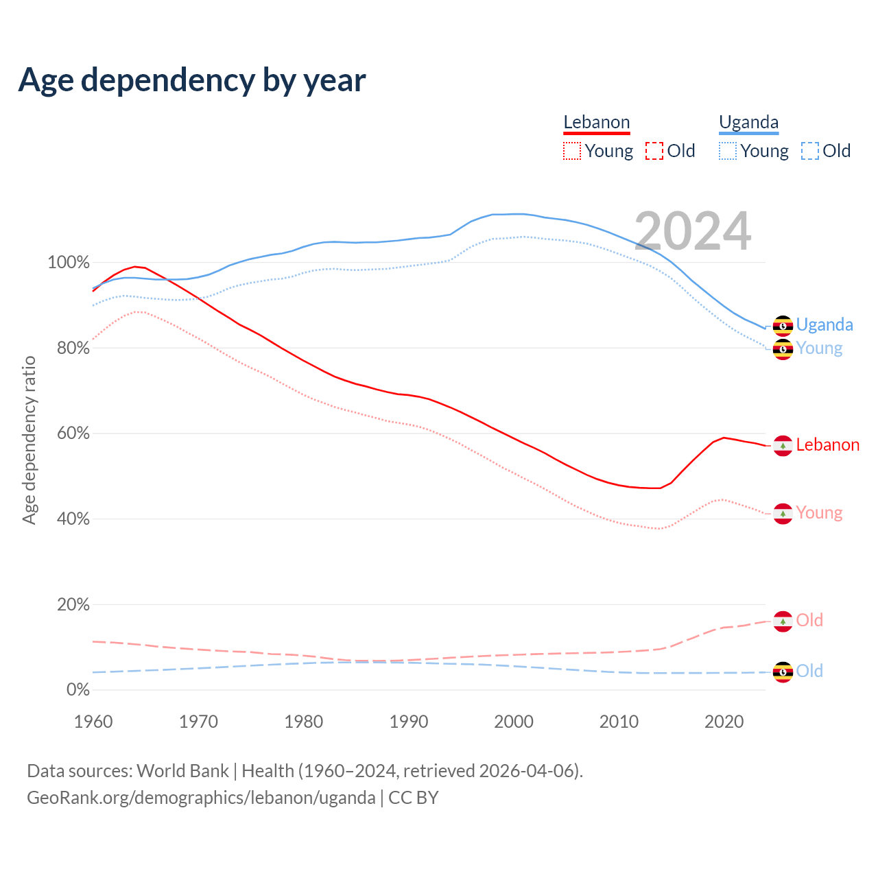 - Lebanon is ranked 106/196 by median age (oldest to youngest) vs 187/196 for Uganda.
