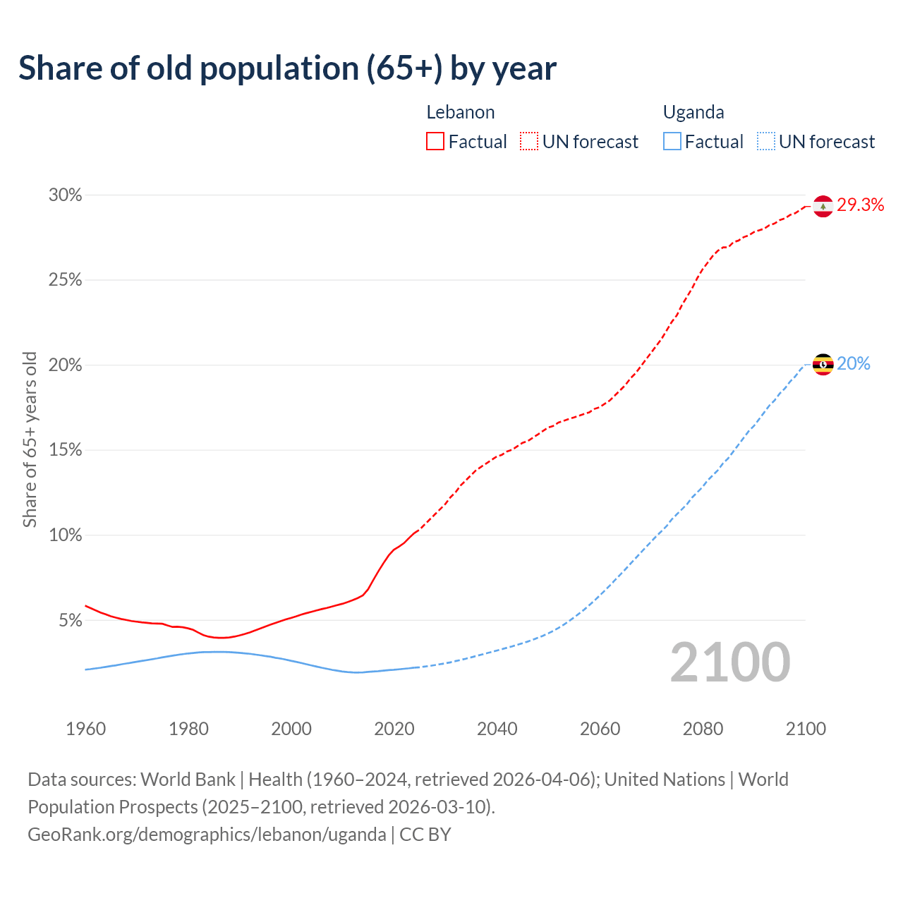 The share of older people aged 65 and over is 10.1% in Lebanon and 2.19% in Uganda. Life expectancy in Lebanon compared to Uganda .