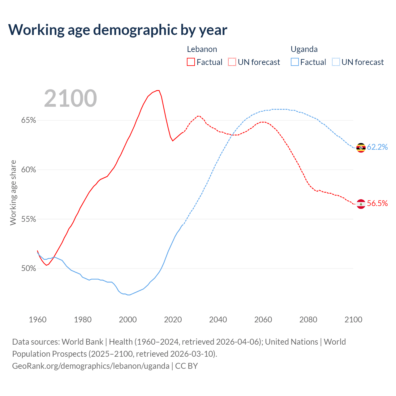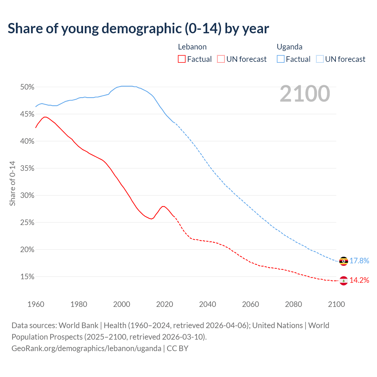 Median age Lebanon vs Uganda, 1960-2100