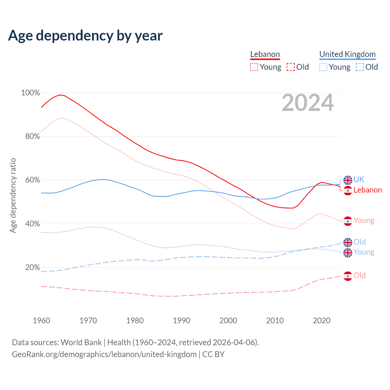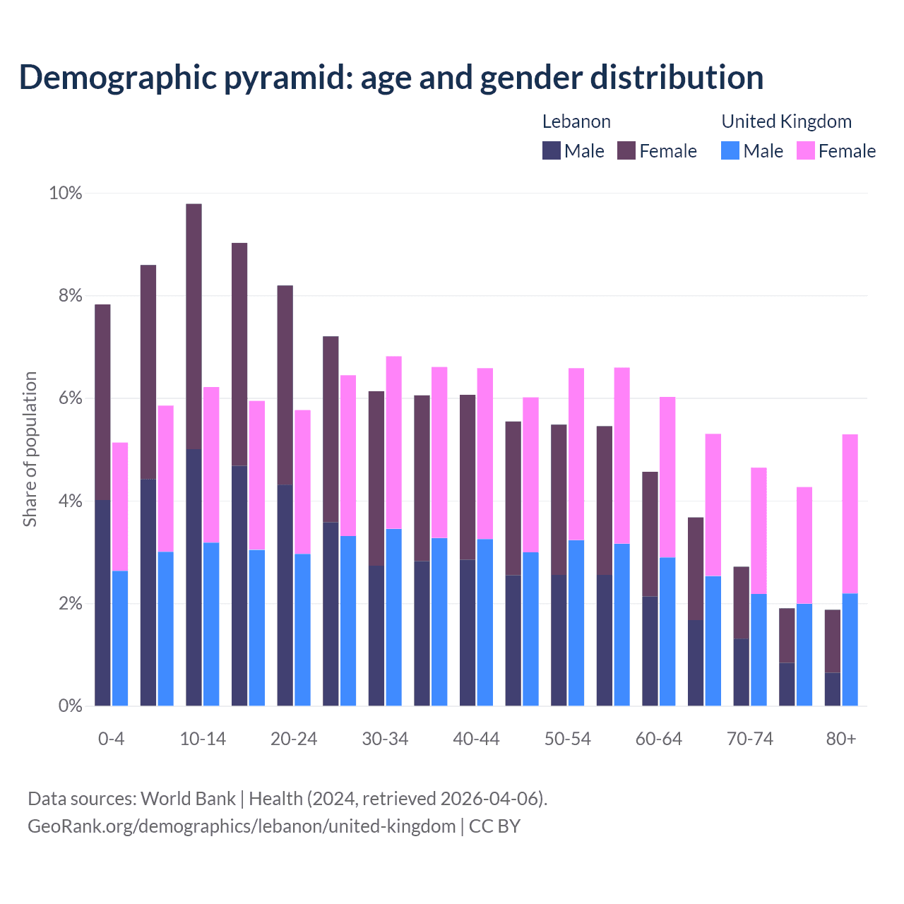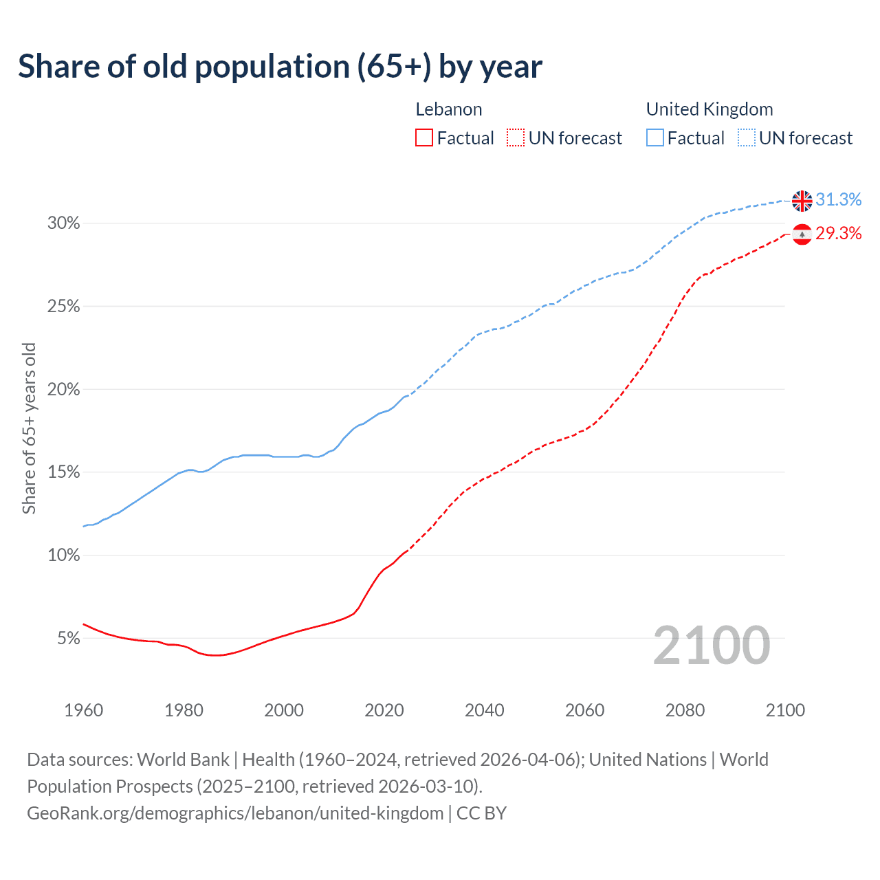 The share of older people aged 65 and over is 10.1% in Lebanon and 19.5% in the United Kingdom. Life expectancy in Lebanon compared to the United Kingdom .