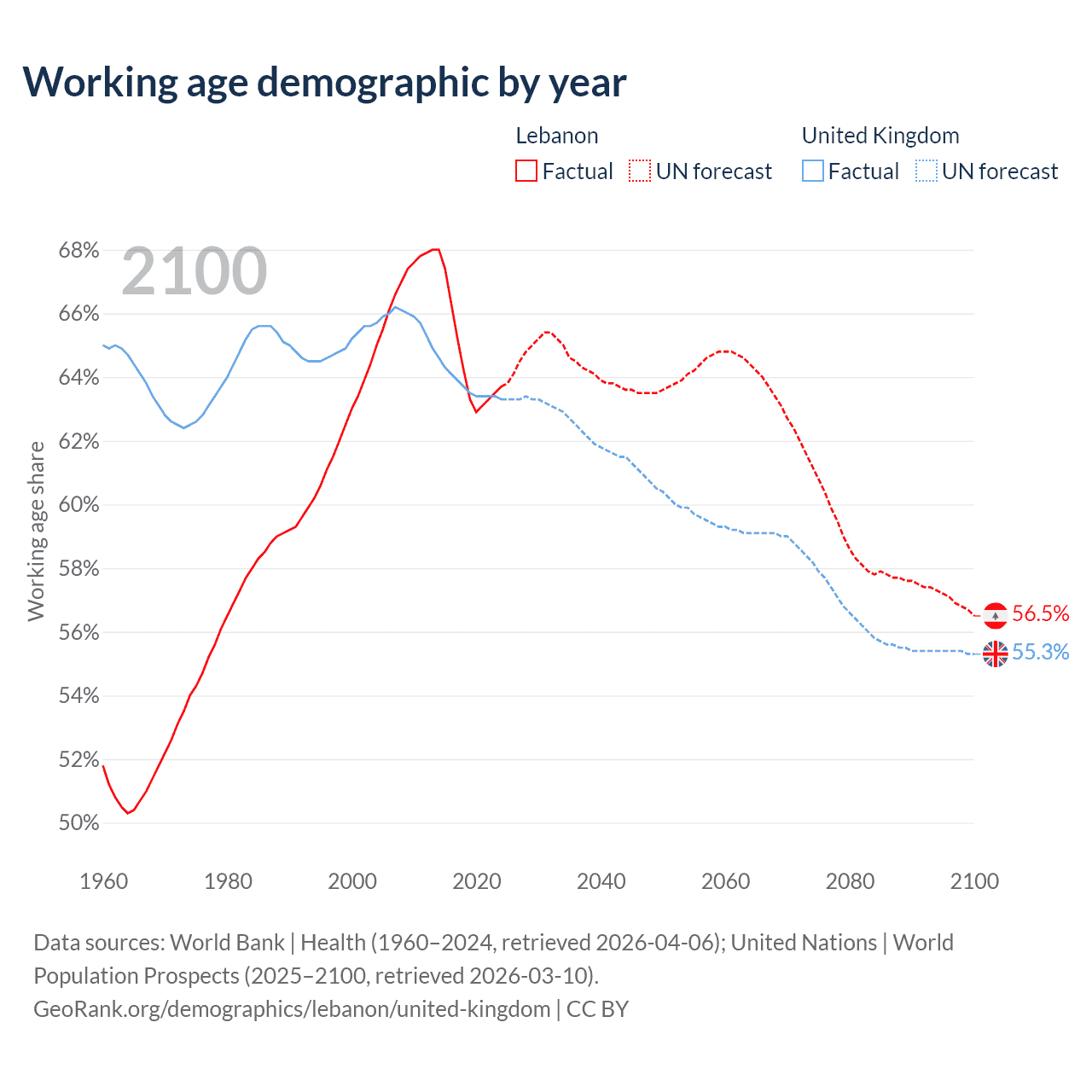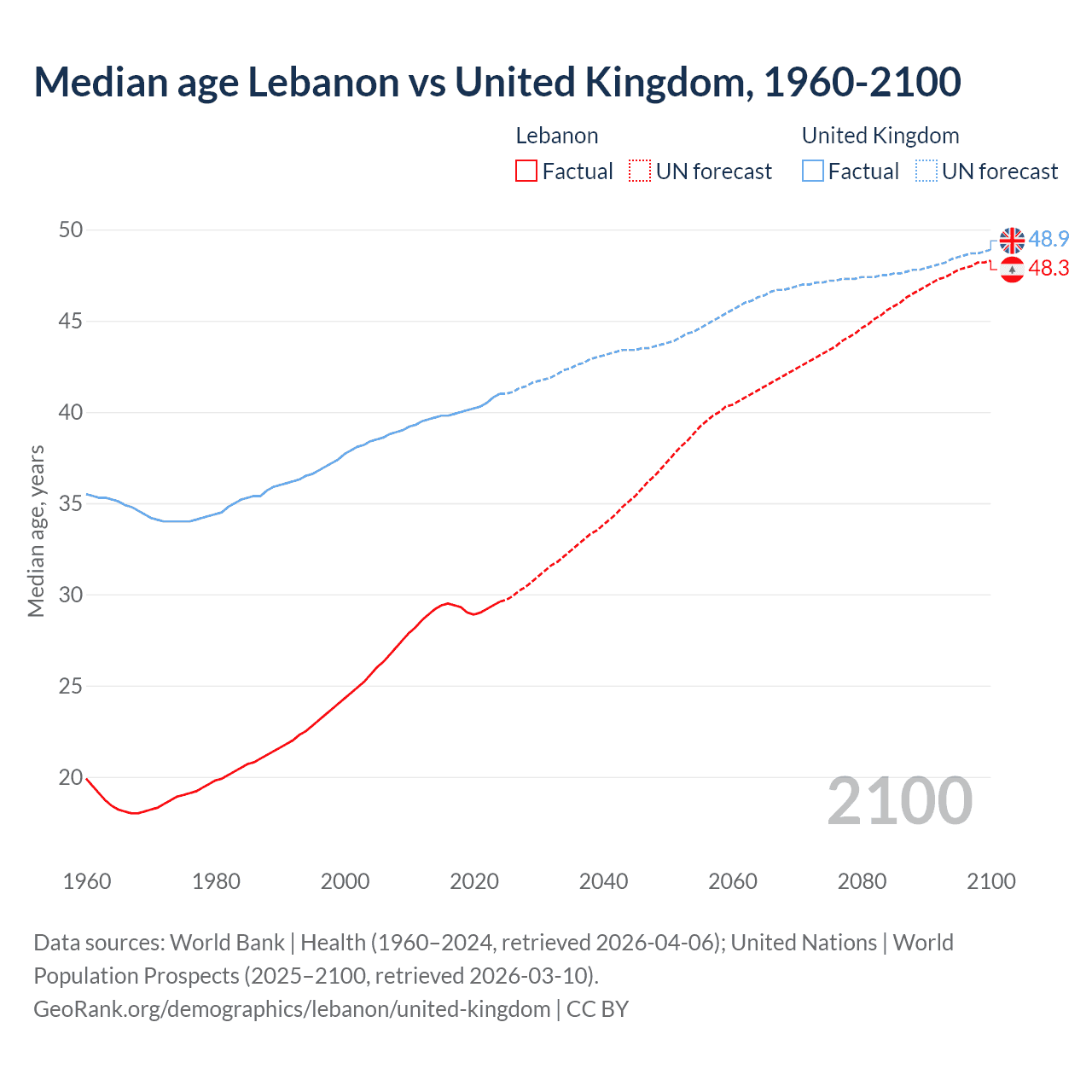 Median age Lebanon vs United Kingdom, 1960-2100