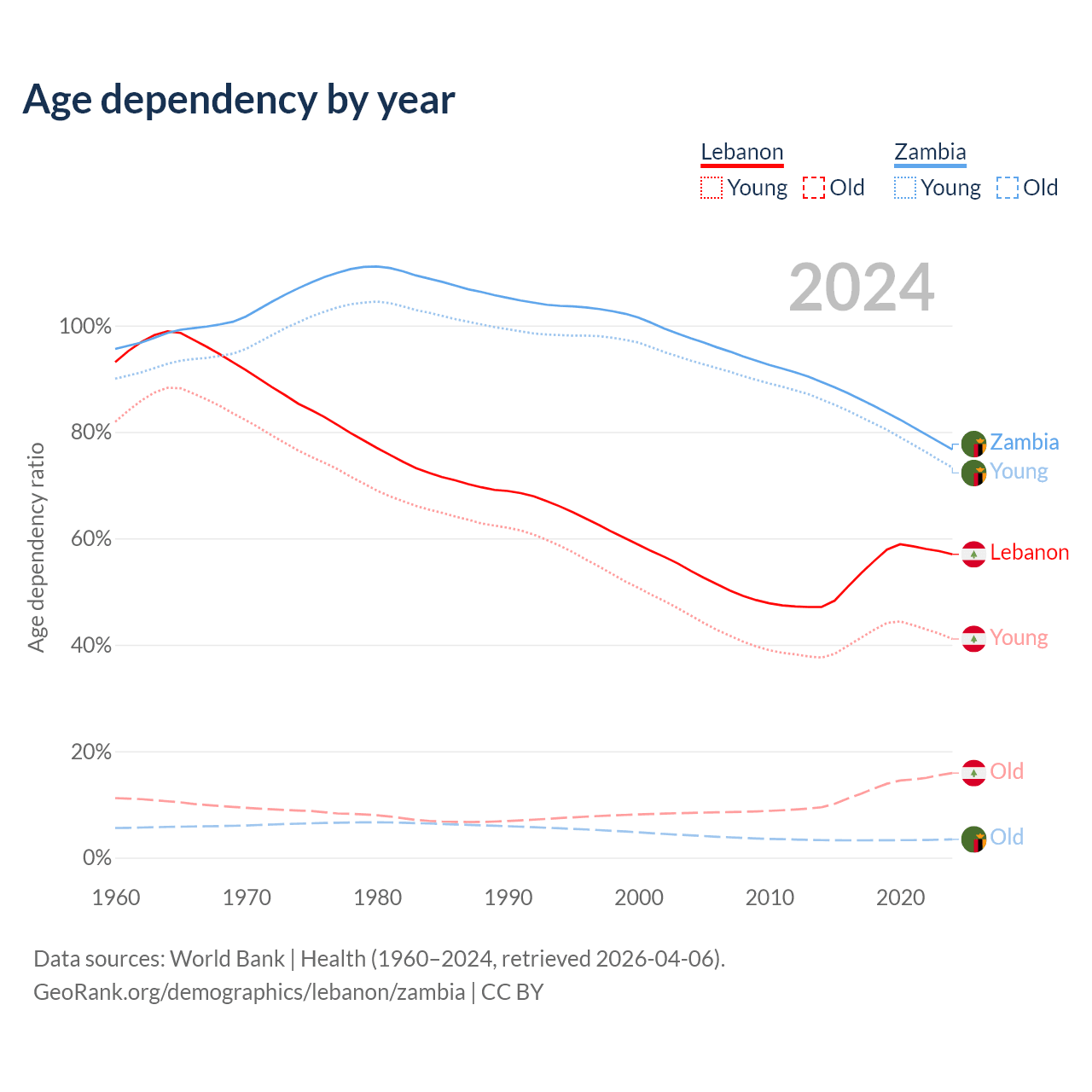 - Lebanon is ranked 106/196 by median age (oldest to youngest) vs 182/196 for Zambia.