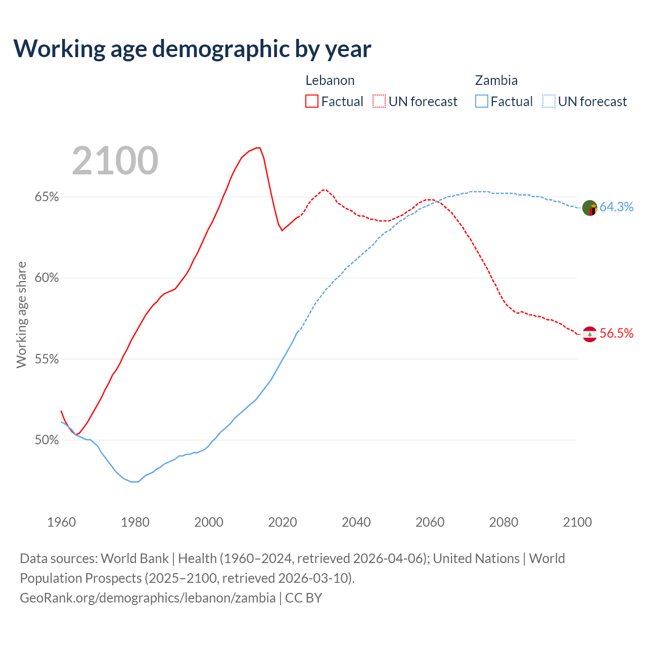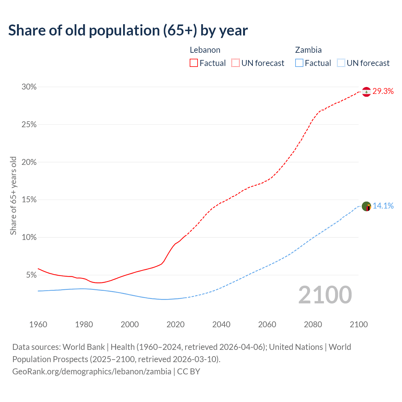 The share of older people aged 65 and over is 10.1% in Lebanon and 1.95% in Zambia. Life expectancy in Lebanon compared to Zambia .