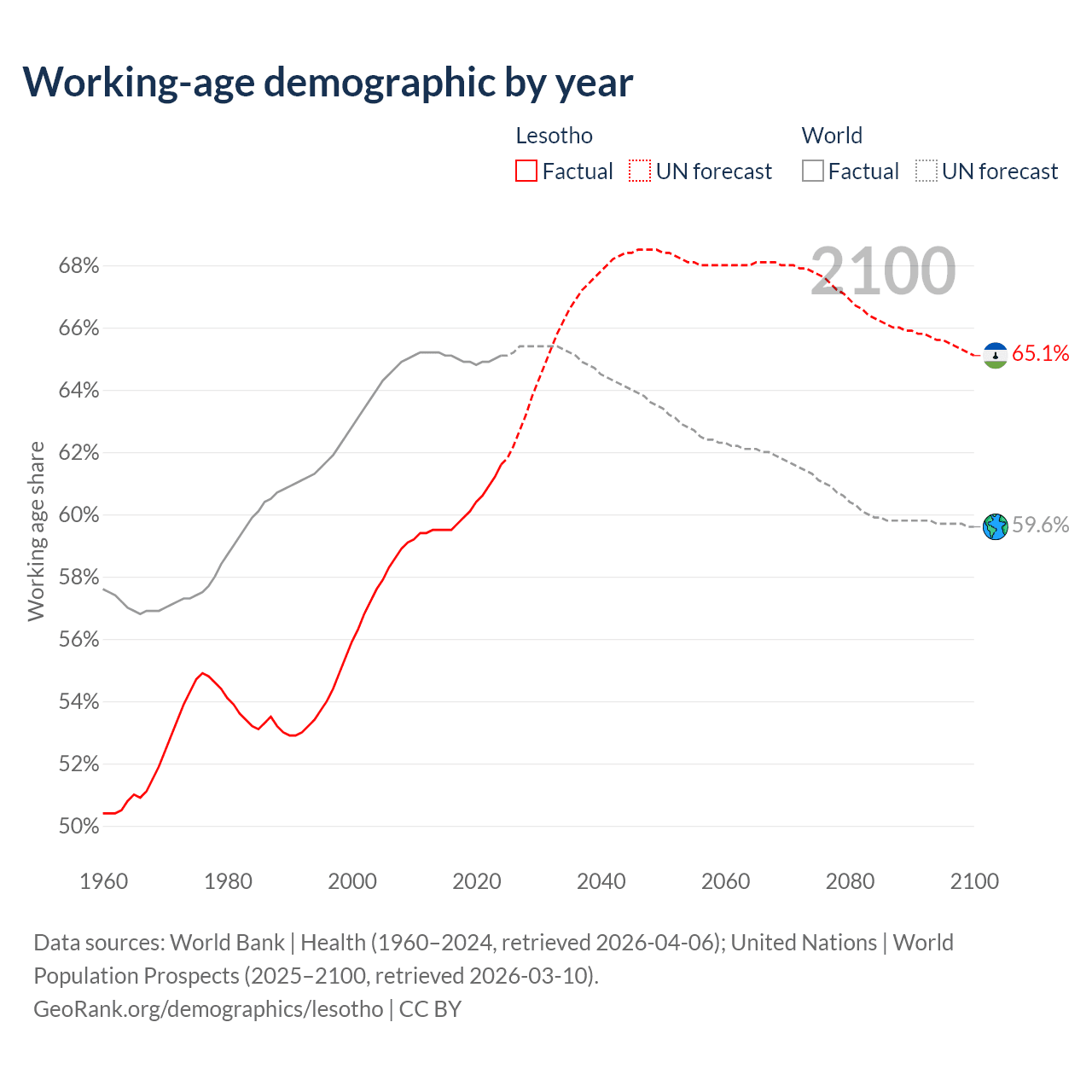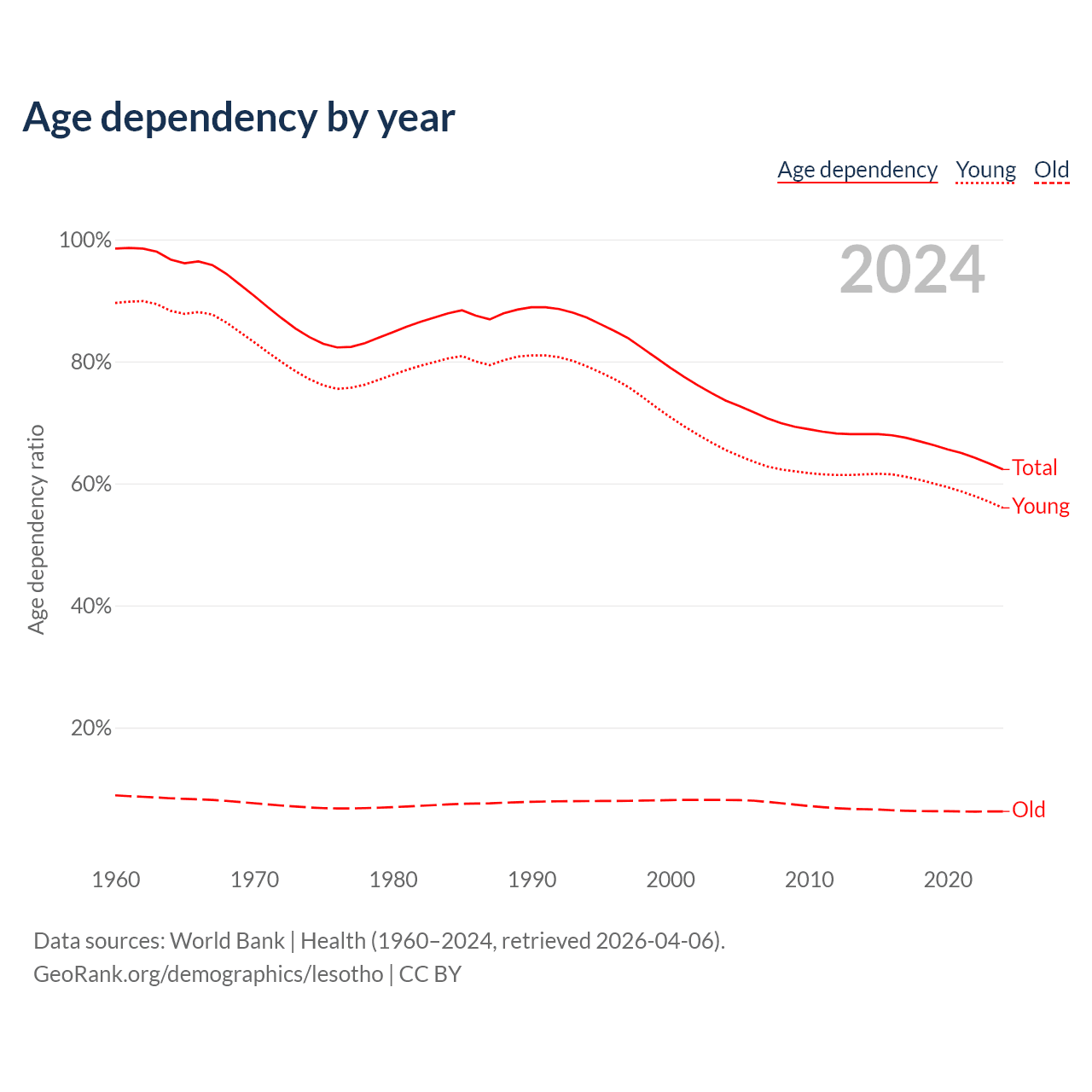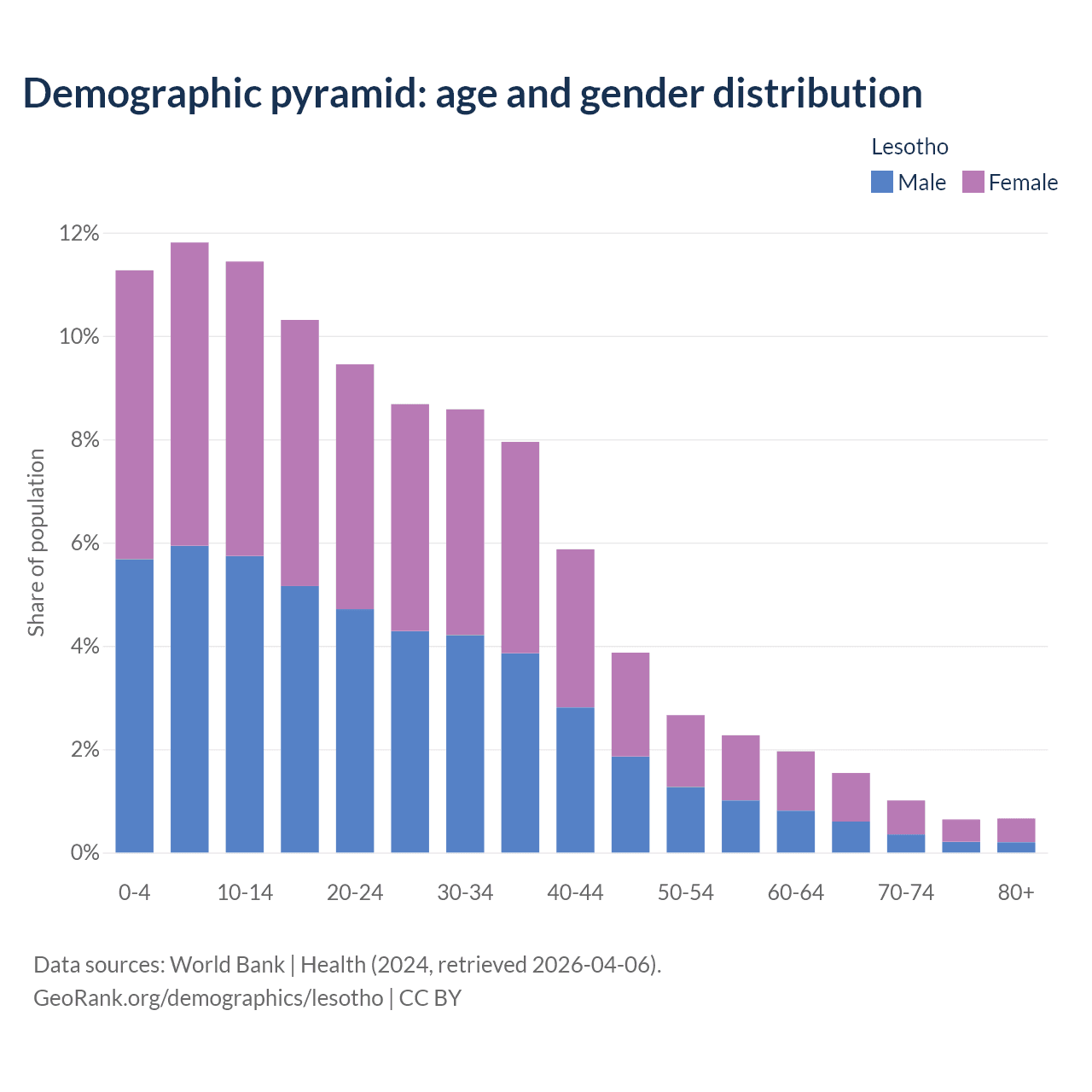 With a population of 2.34M people, Lesotho has a median age of 22.7 years which makes it the 143/196 oldest country. 34.5% of the demographic are children 0-14 years old, 61.6% are working-age people aged 15-64, and 3.86% are older population aged 65+ years.