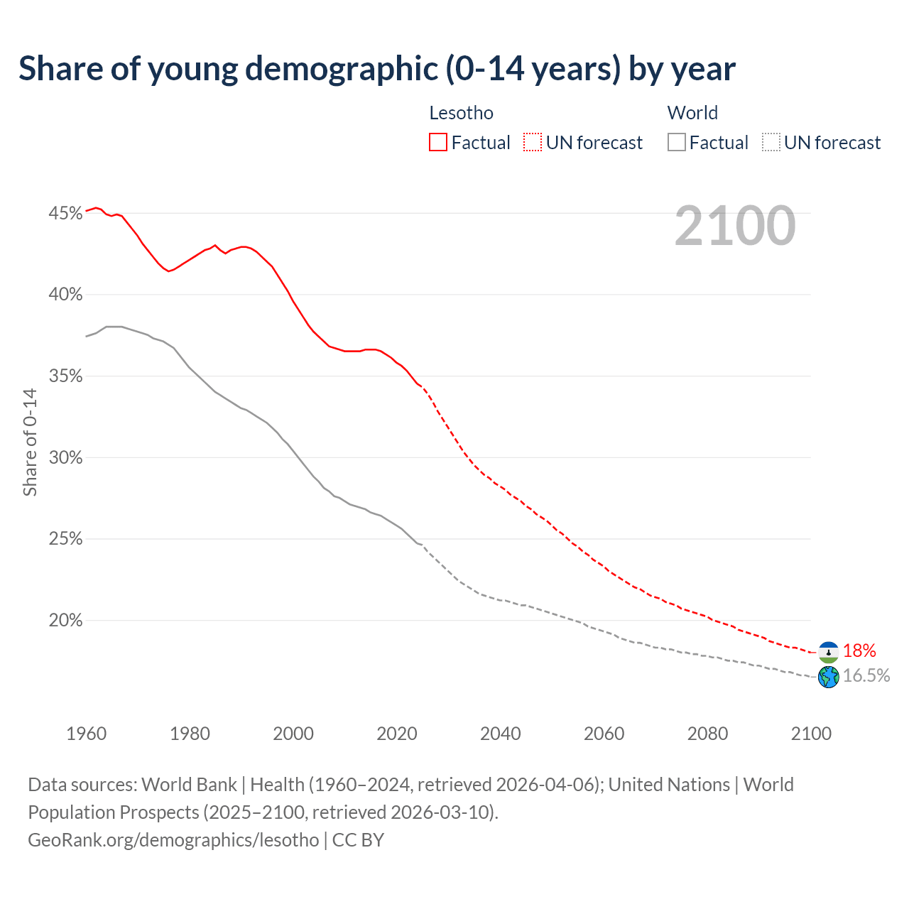 The share of children aged 0-14 in Lesotho decreased from 37.7% to 34.5% between 2004 and 2024 due to changes in birth rates.