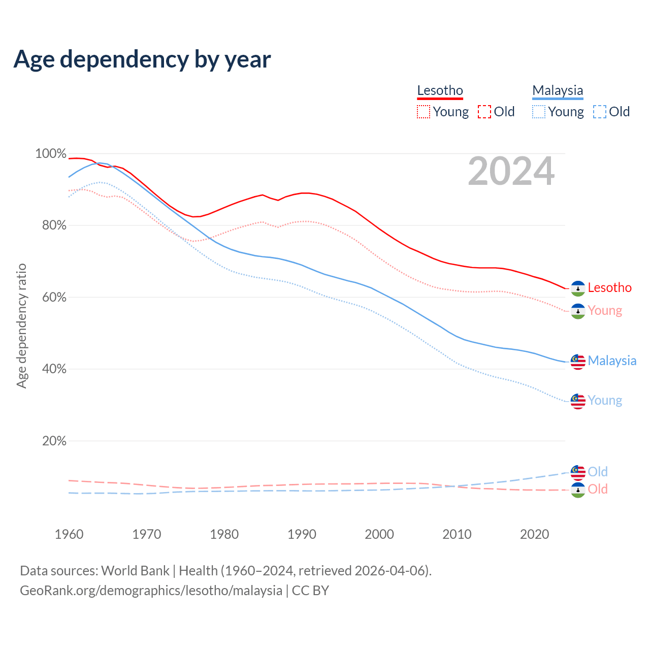 - The share of old-age demographic (65+) in Lesotho is 3.86% vs 7.74% in Malaysia.