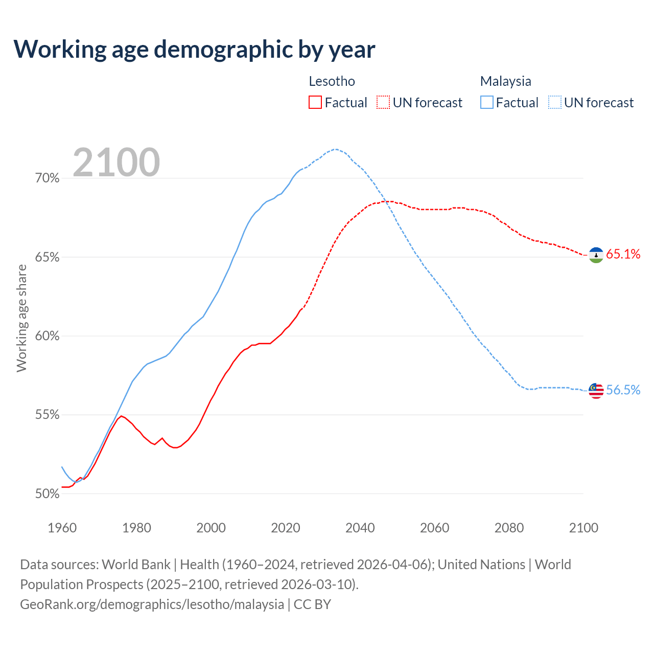 Median age Lesotho vs Malaysia, 1960-2100