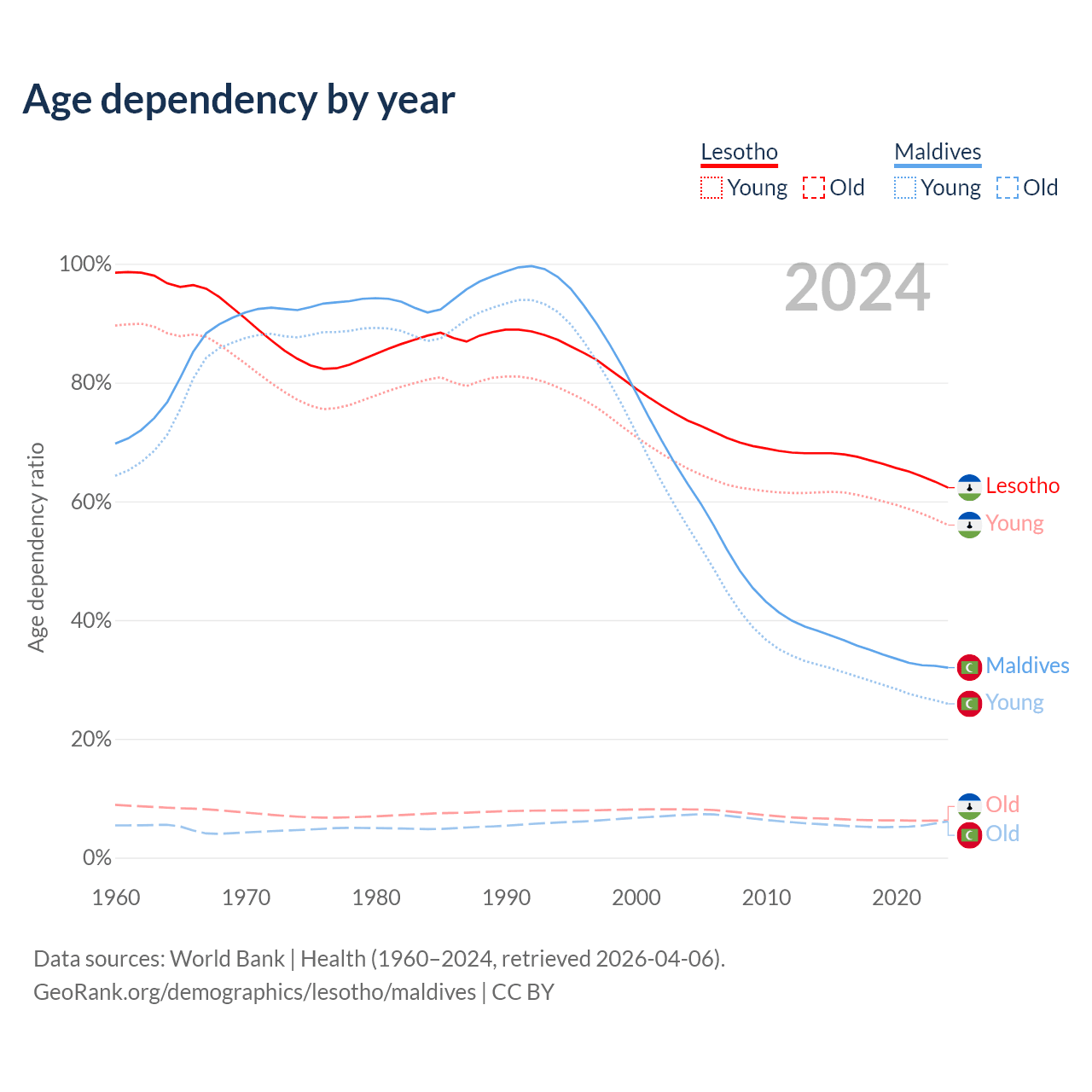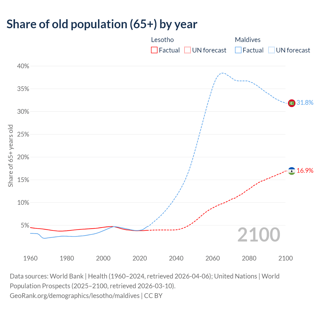 - The share of old-age demographic (65+) in Lesotho is 3.86% vs 4.64% in Maldives.