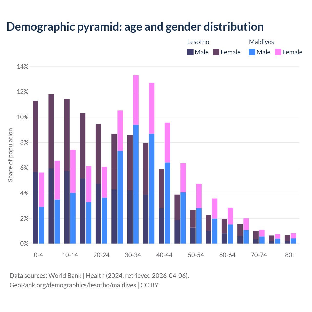 - As of 2026, the population of Lesotho is 2.4M vs 532K in Maldives - 4.5 times difference.