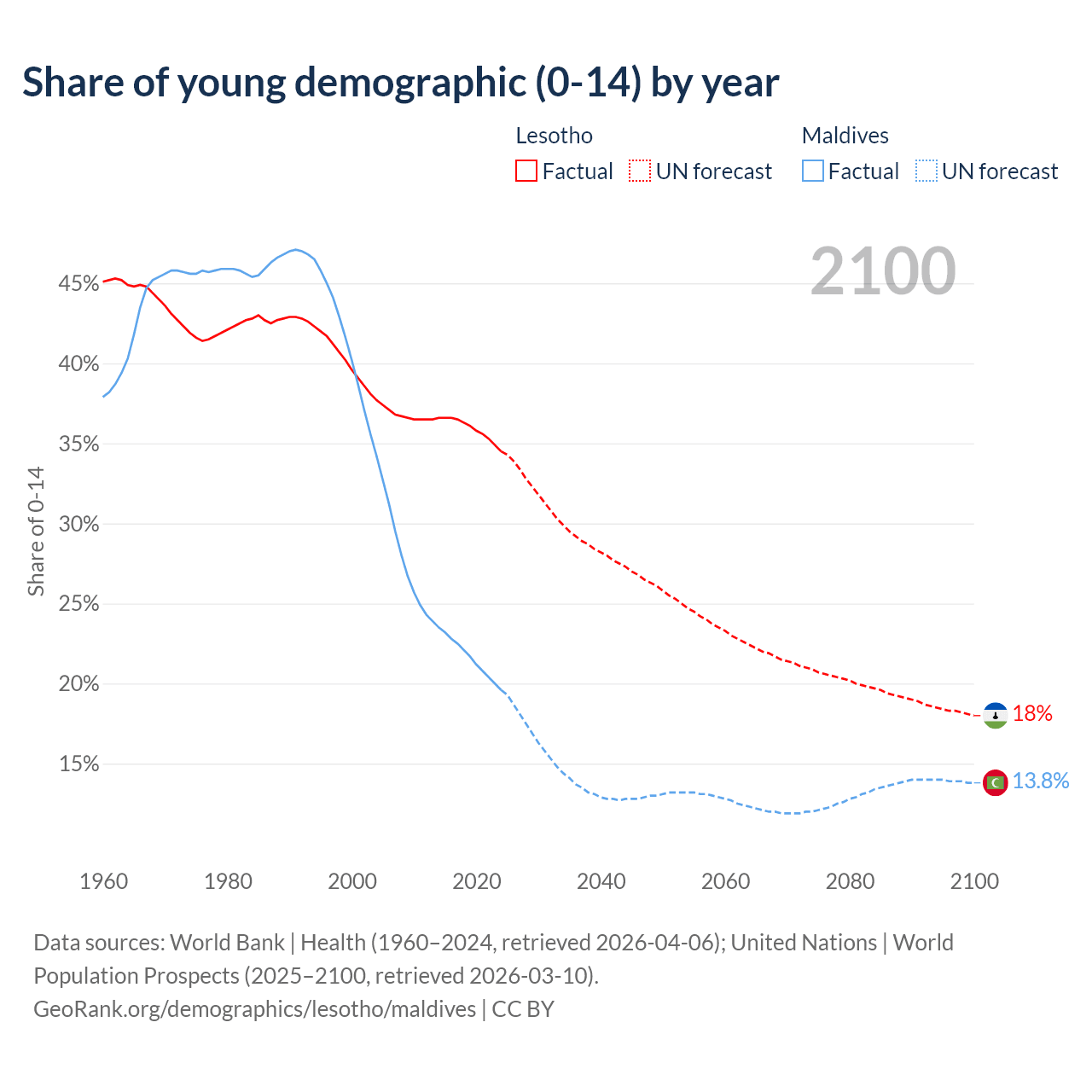 - The share of young demographic (0-15 years old) in Lesotho is 34.5% vs 19.6% in Maldives.