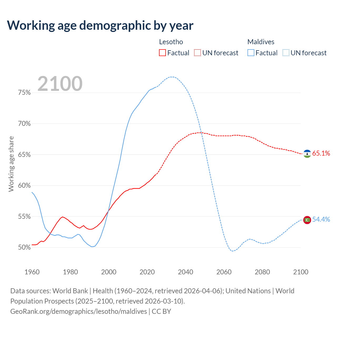 - Lesotho has 1.48M working age adults (aged 15-64) vs 403K in Maldives.