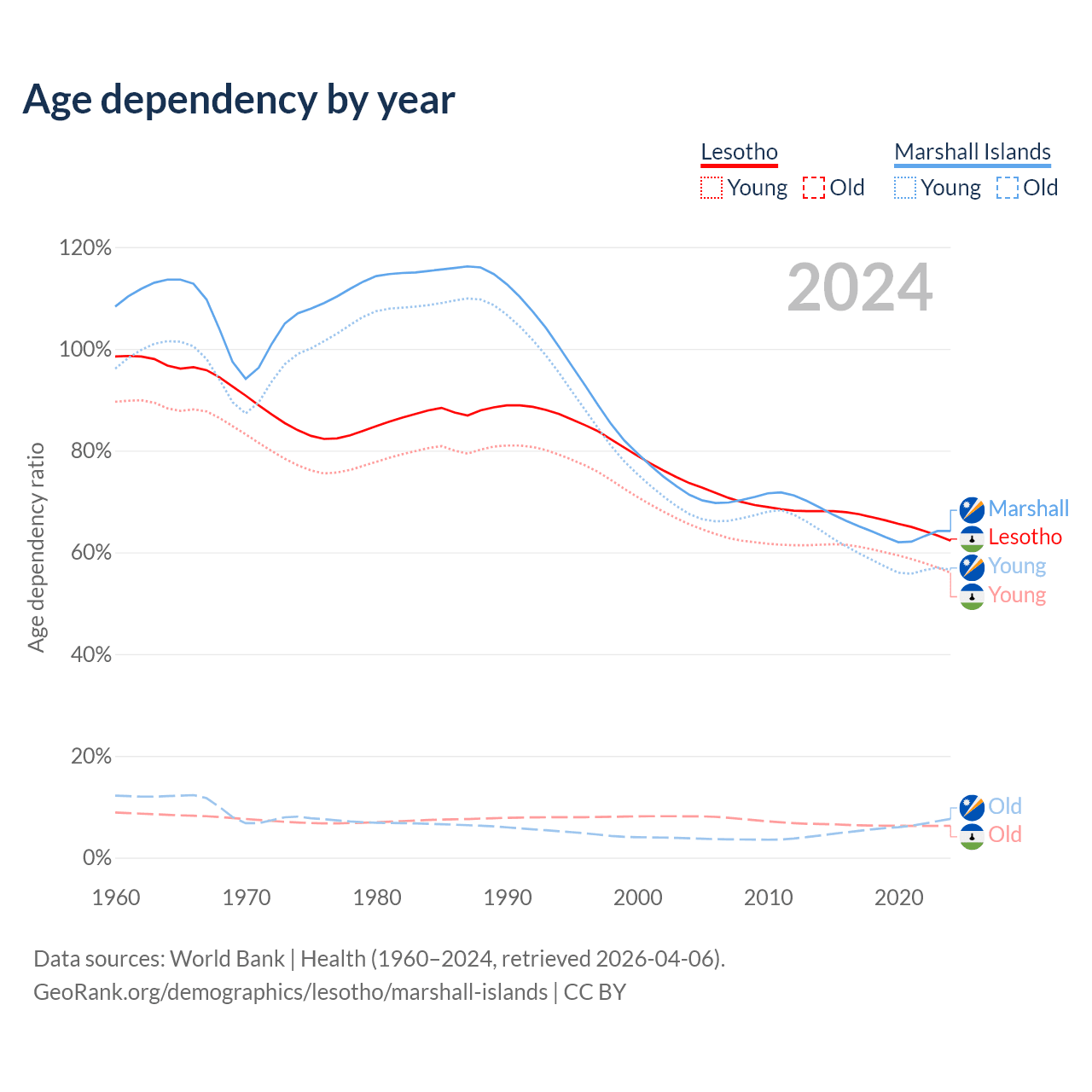 - The share of old-age demographic (65+) in Lesotho is 3.86% vs 4.64% in the Marshall Islands.