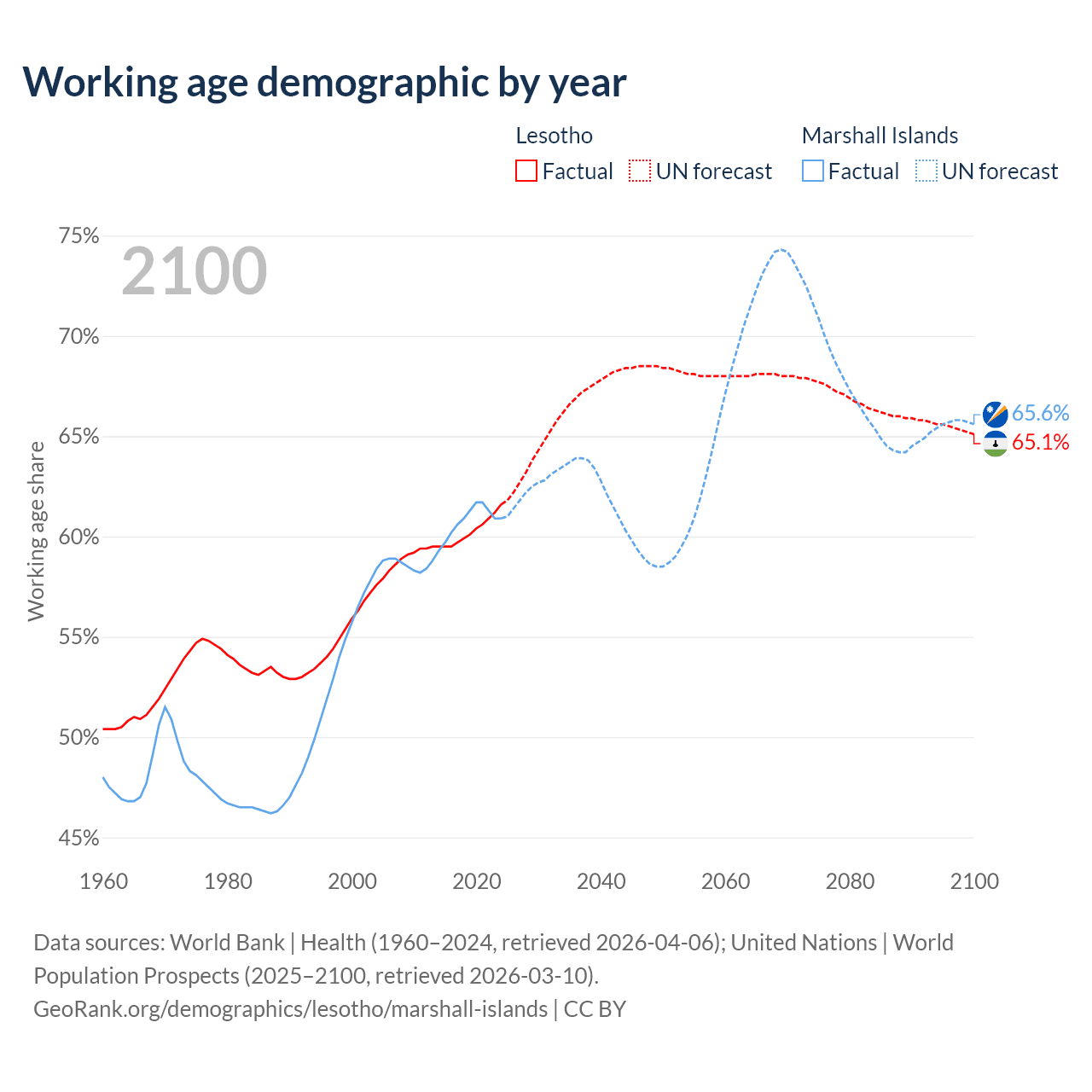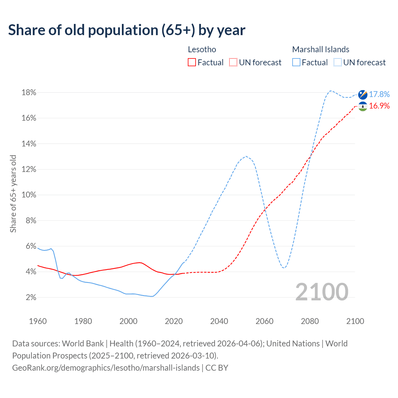 The share of older people aged 65 and over is 3.86% in Lesotho and 4.64% in the Marshall Islands. Life expectancy in Lesotho compared to the Marshall Islands .