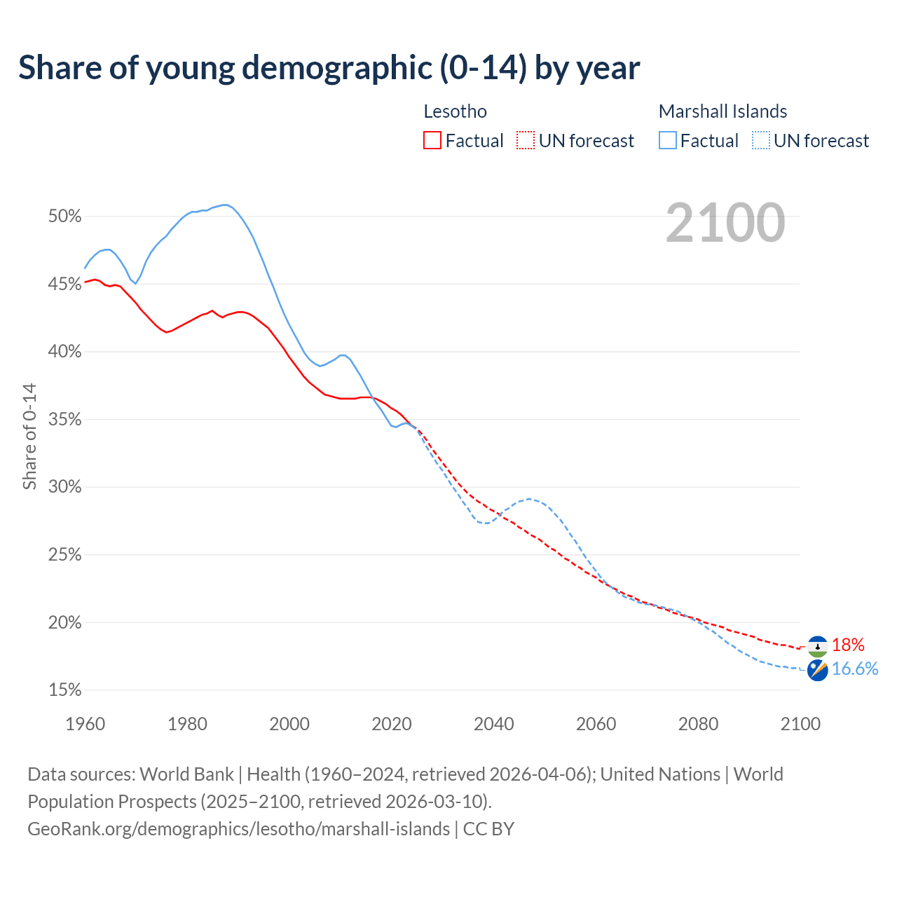 - The share of young demographic (0-15 years old) in Lesotho is 34.5% vs 34.5% in the Marshall Islands.