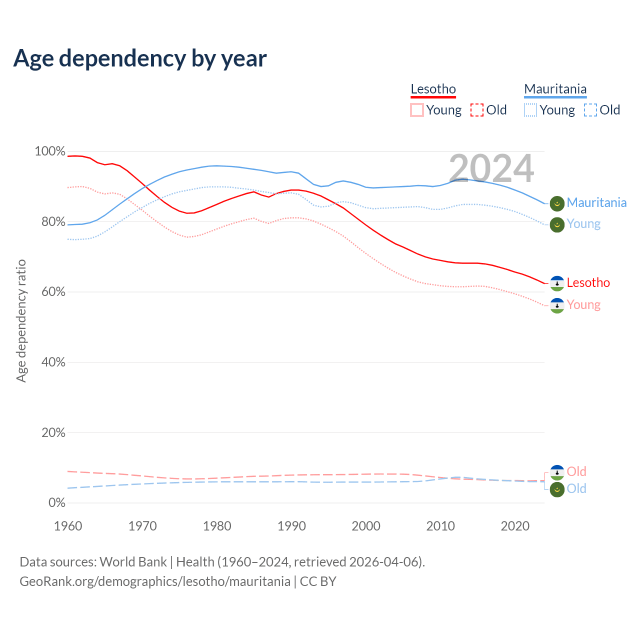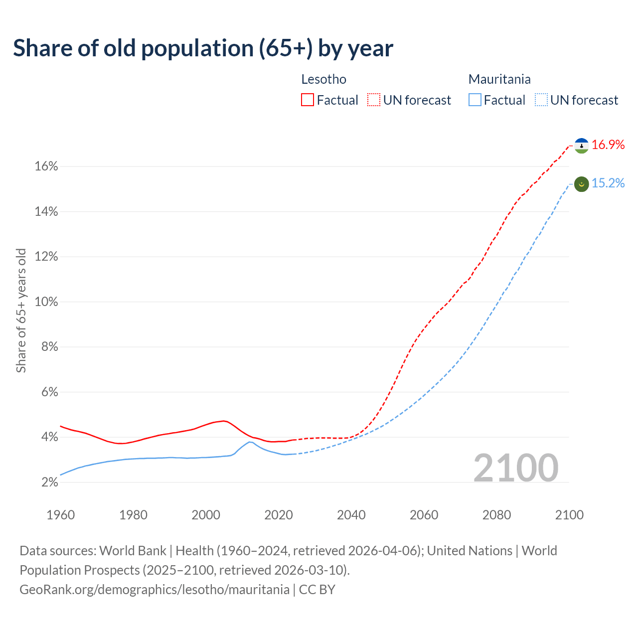 - The share of old-age demographic (65+) in Lesotho is 3.86% vs 3.23% in Mauritania.